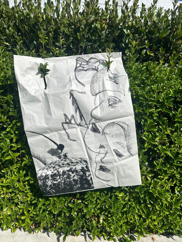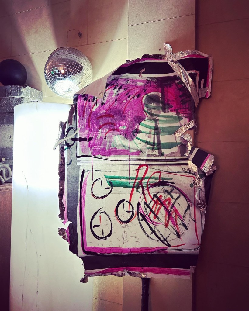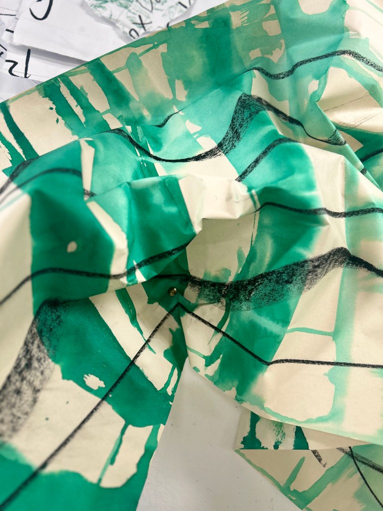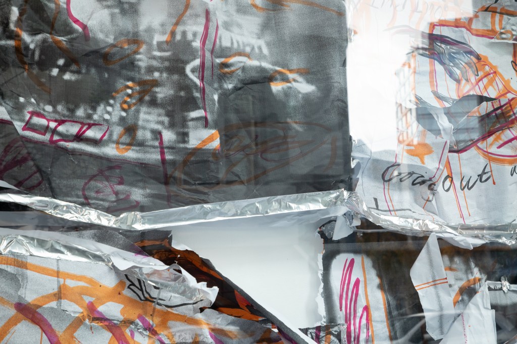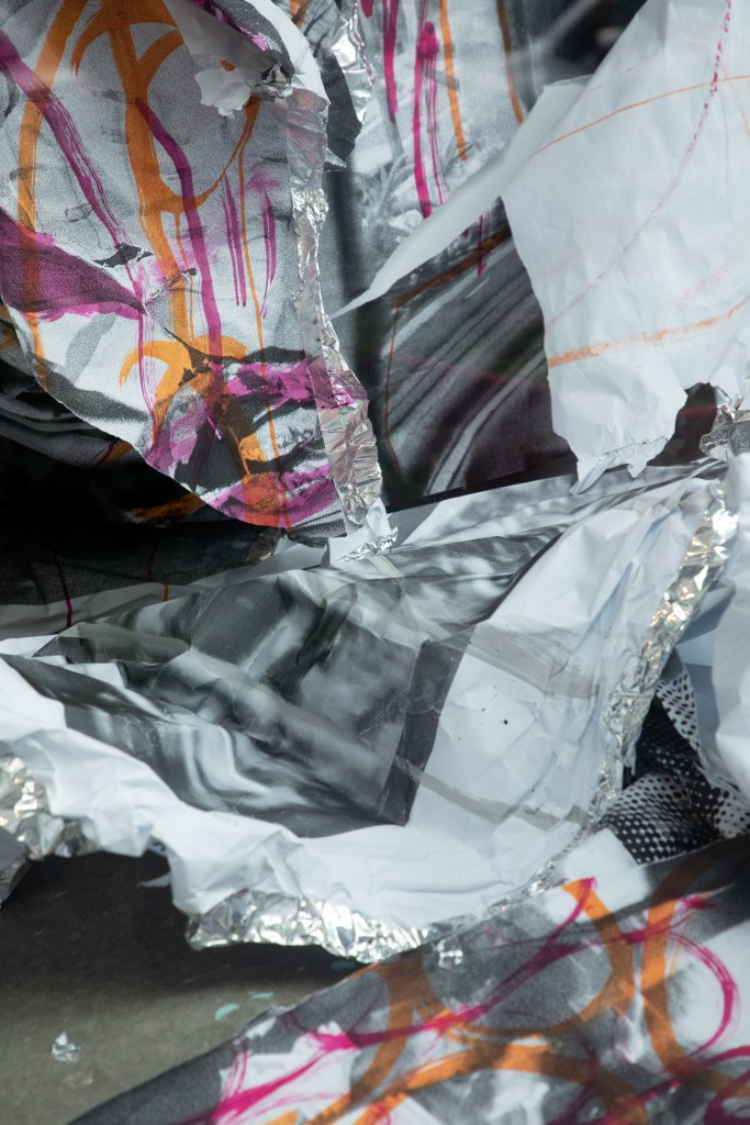 I apply this repetition composition process through works I call blow-ups, named in reference to Michelangelo Antonio’s pop-art film about the ambiguity of perception within a city neighbourhood. To make a blow-up, I start with an A4 ink drawing traced from a film-still, this drawing is photocopied to an A0 scale (400%) multiple times, on the multiples I paint and foil-tape layers following the lines of the original drawing, I roughly roll the papers then unfurling them pin them to the wall; lastly, I cast a bright light on the layers creating further traces of shadow. Being in the continuous presence of the process, I identify where materials take emphasis, for example, the ink in the line photocopied or the paper in the crumpled rolled work. This form of engagement composes physical material in a poetic rhythm.