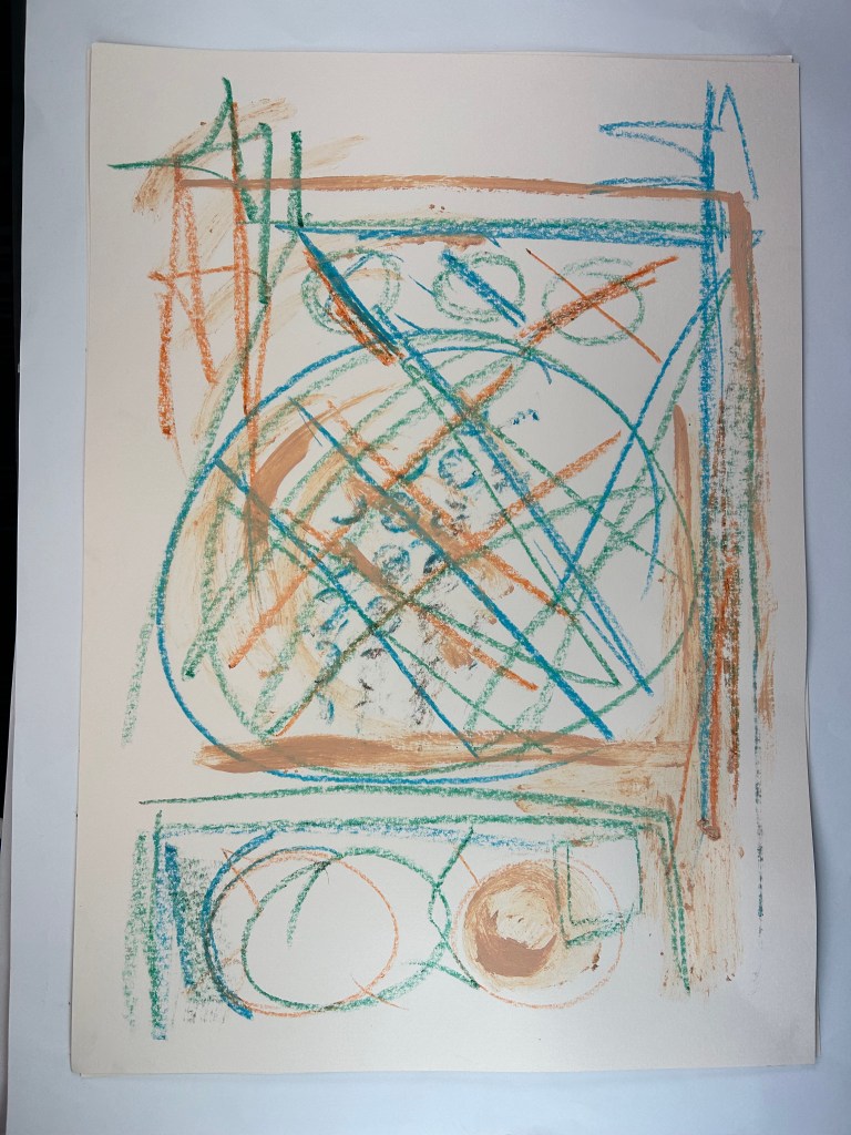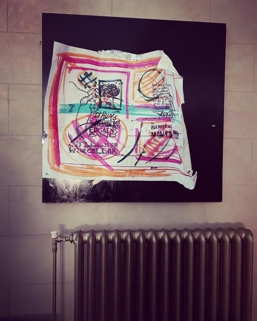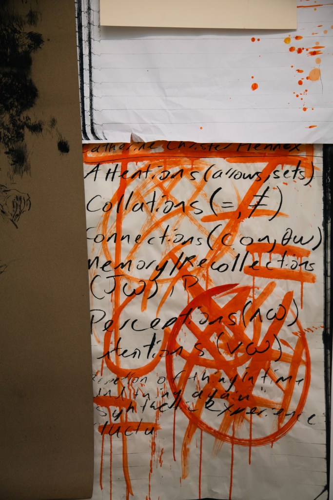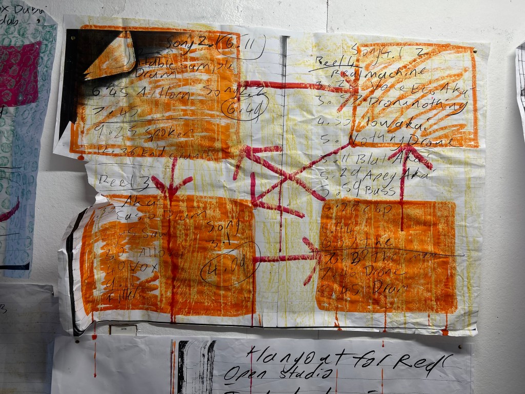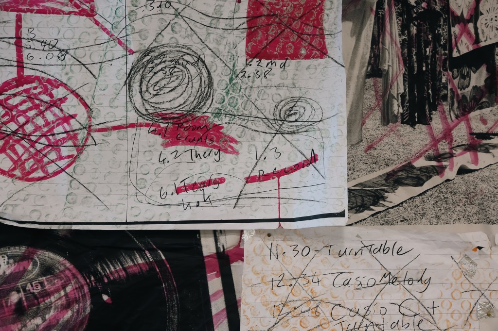 Pencil, wallpaper, house paint. Possible score. Notation of movement. Emphasis. Layers at play. Here all the screens are collapsed in flat fields. The composition of “ranch slider””Lounge suite w/ spilt wine (minor changes to rental)