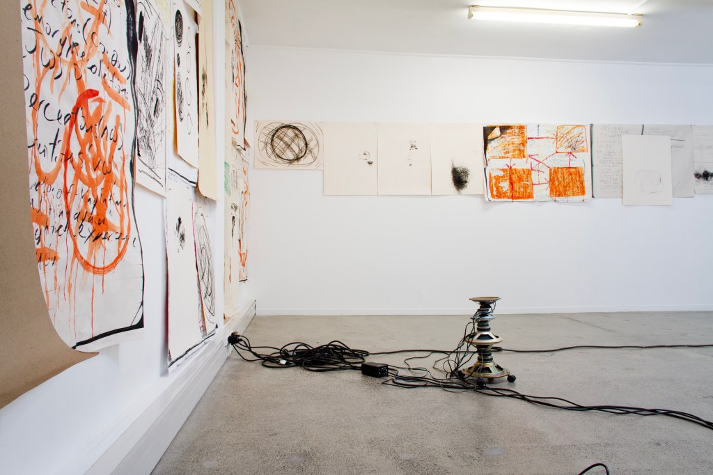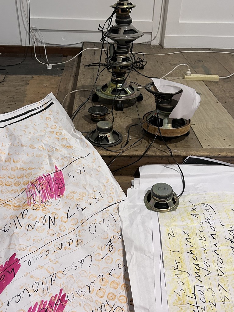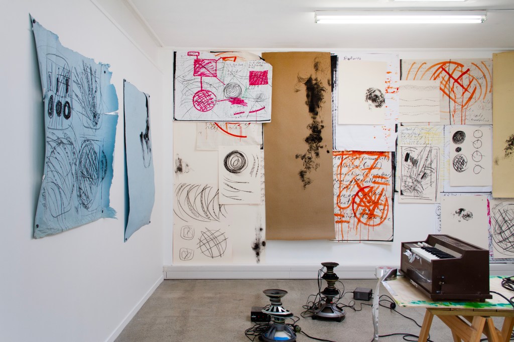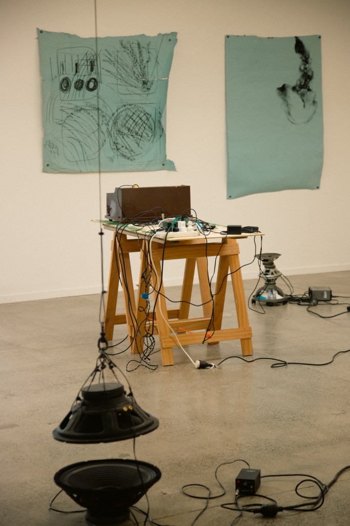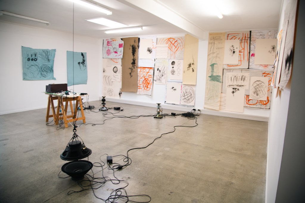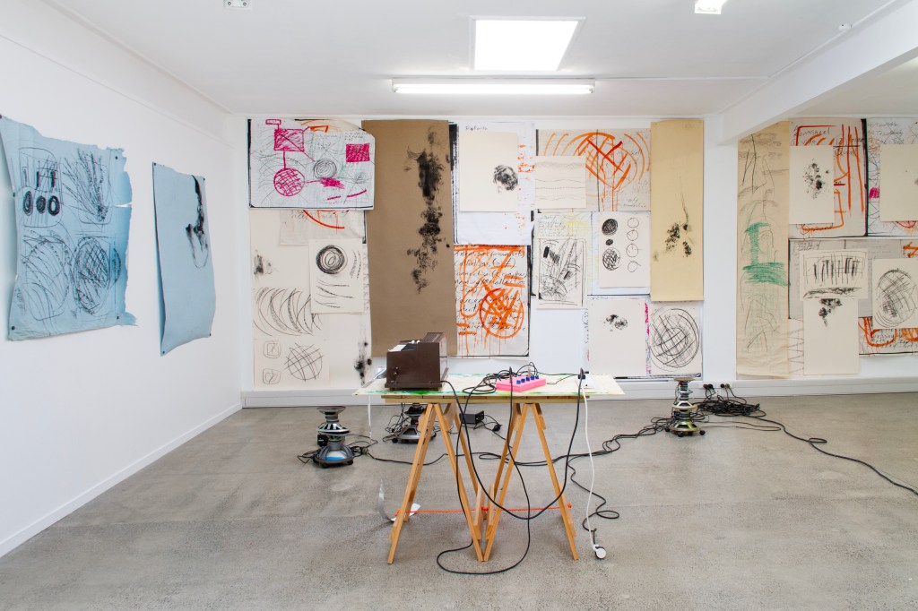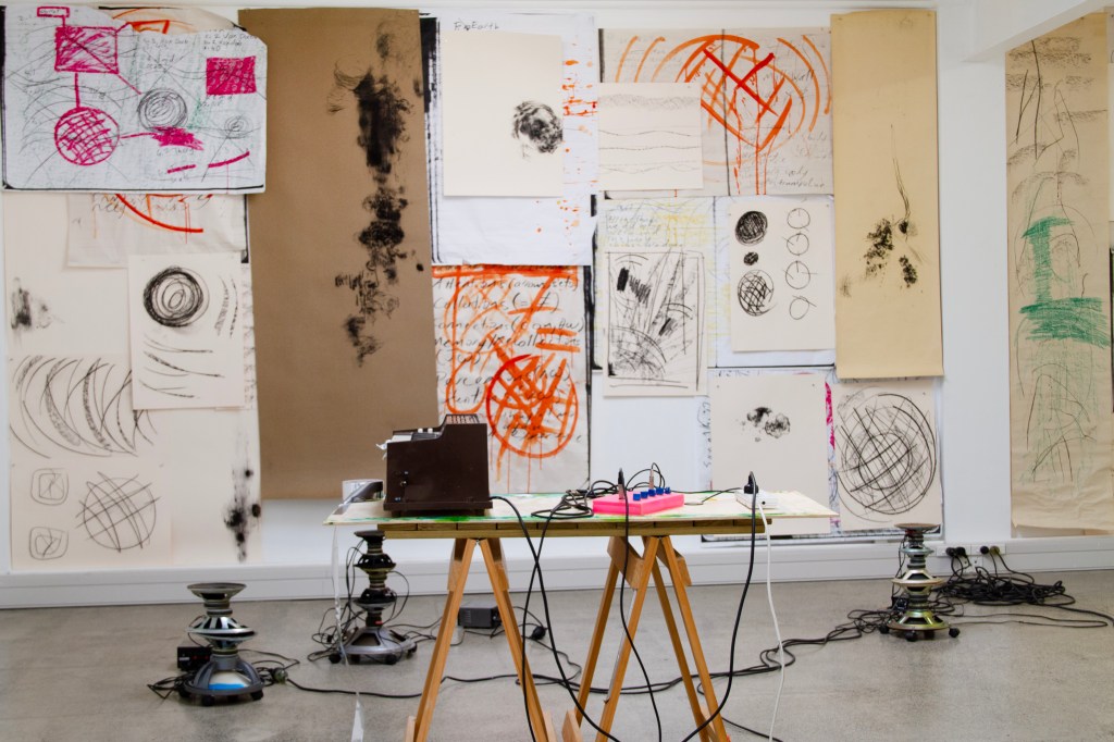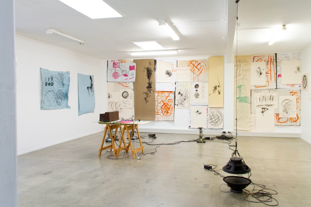 Invisible Neighbours is an installation of drawings, text and sound objects that focus on the generative nature of feedback. As a collaboration the artists are working with feedback as a sonic material that they create and respond to, through drawing, electromagnetism, pedals, amps, keyboard, bodies, conversations and listening to special places.