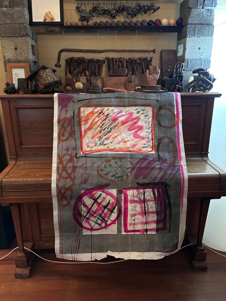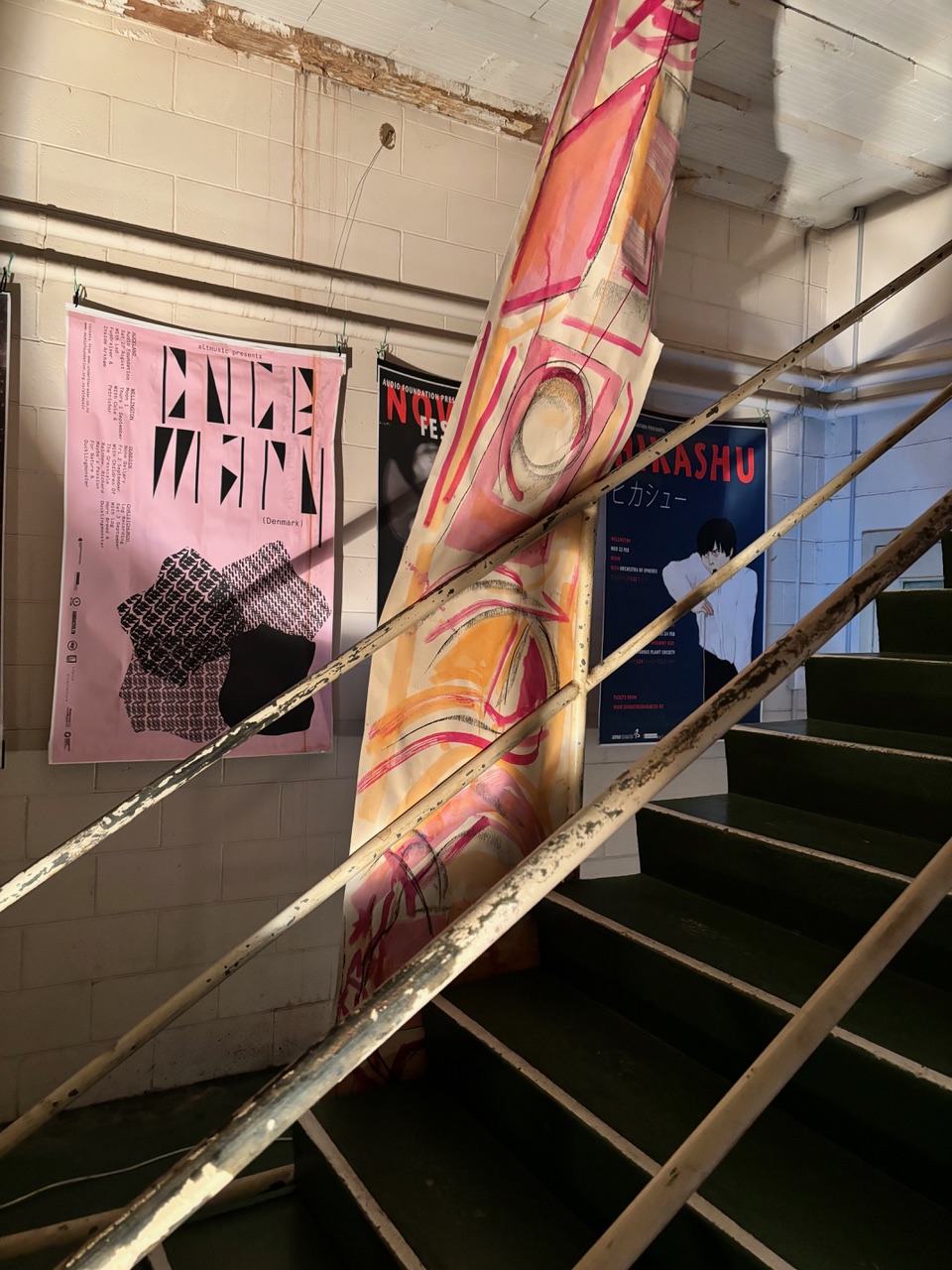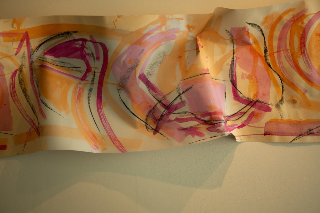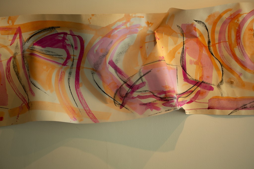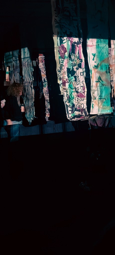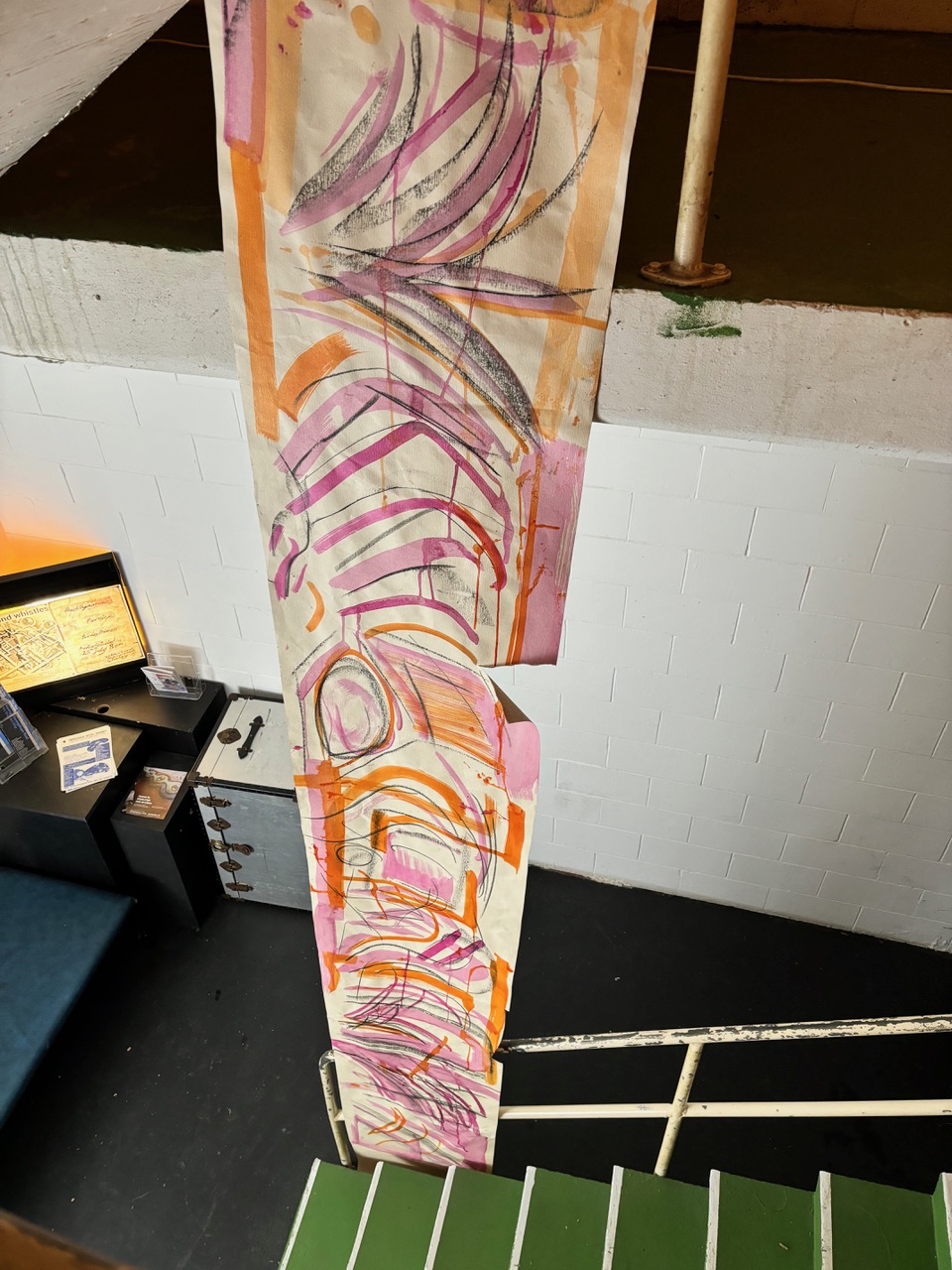 We gather in the lobby. Prepared and dressed up. A scroll of wallpaper painted with waves of pink, green, and orange and glyphs of charcoal wraps in an undulating horizontal direction from the steps to the circle, through to the snack bar, and preshow seating area. At the ticket desk merch table, volunteers draw with Vivids (felt tips) on the wrists of the attendees. Greetings and gathering.