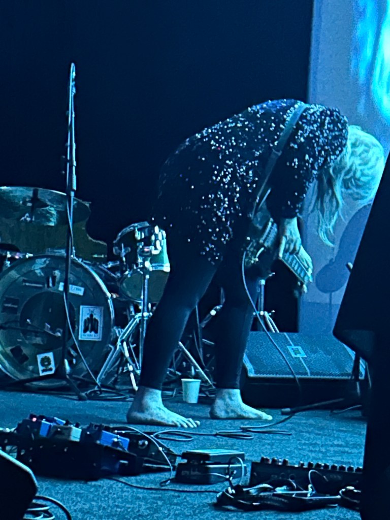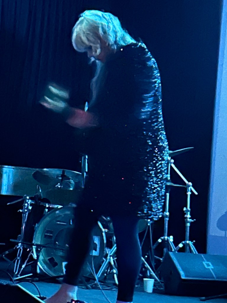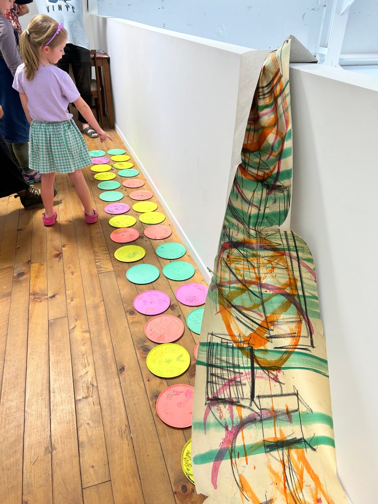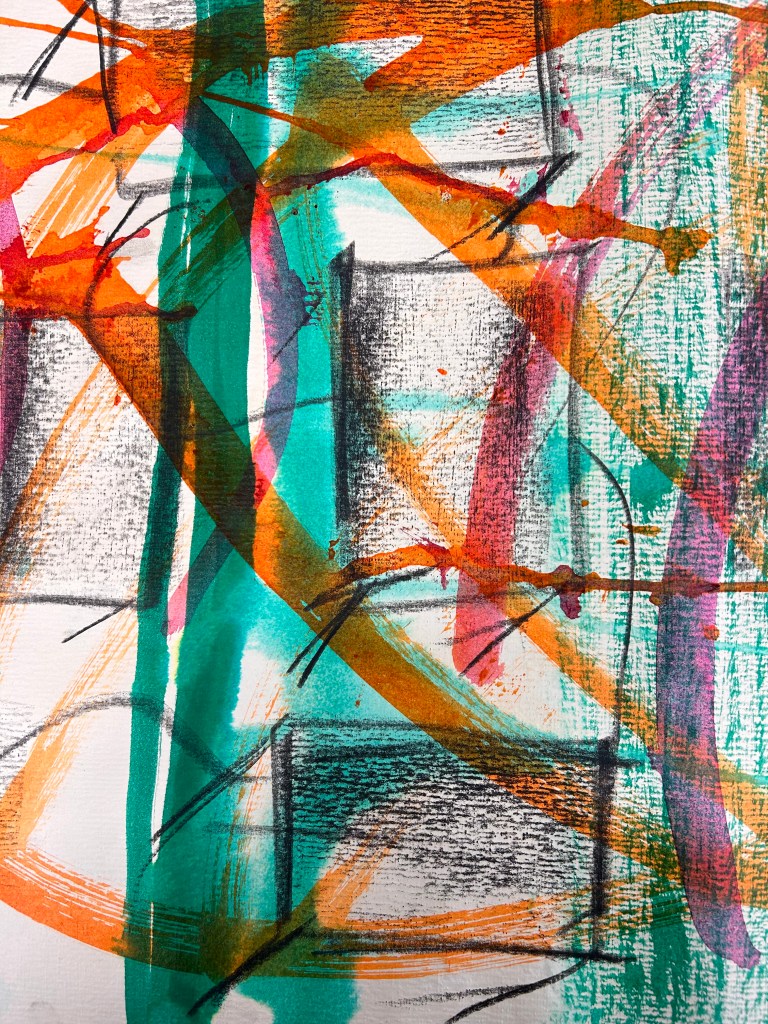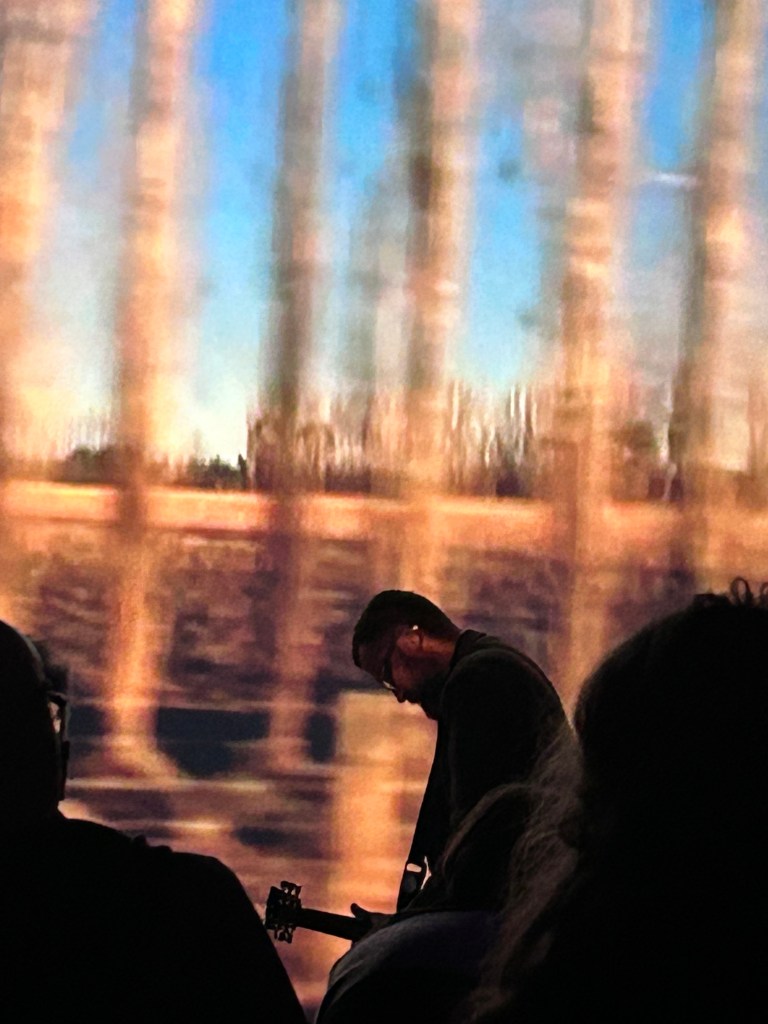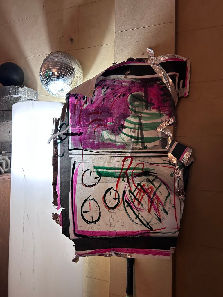 We gather in the lobby. Prepared and dressed up. A scroll of wallpaper painted with waves of pink, green, and orange and glyphs of charcoal wraps in an undulating horizontal direction from the steps to the circle, through to the snack bar, and preshow seating area. At the ticket desk merch table, volunteers draw with Vivids (felt tips) on the wrists of the attendees. Greetings and gathering.