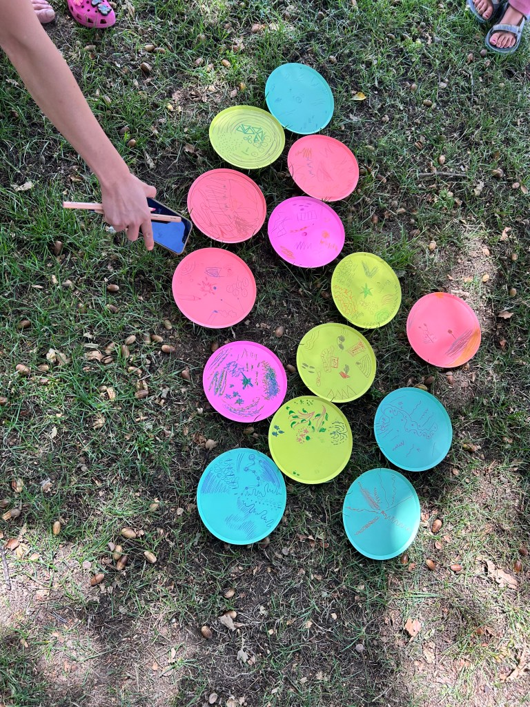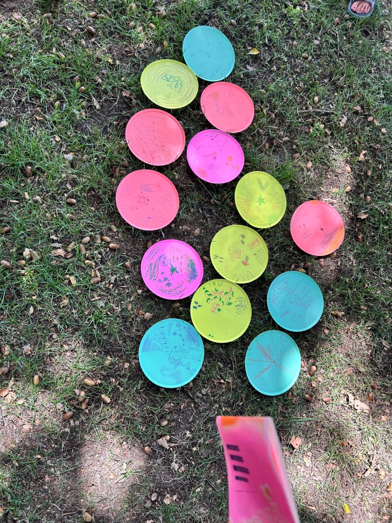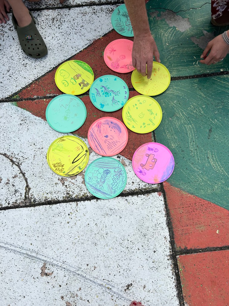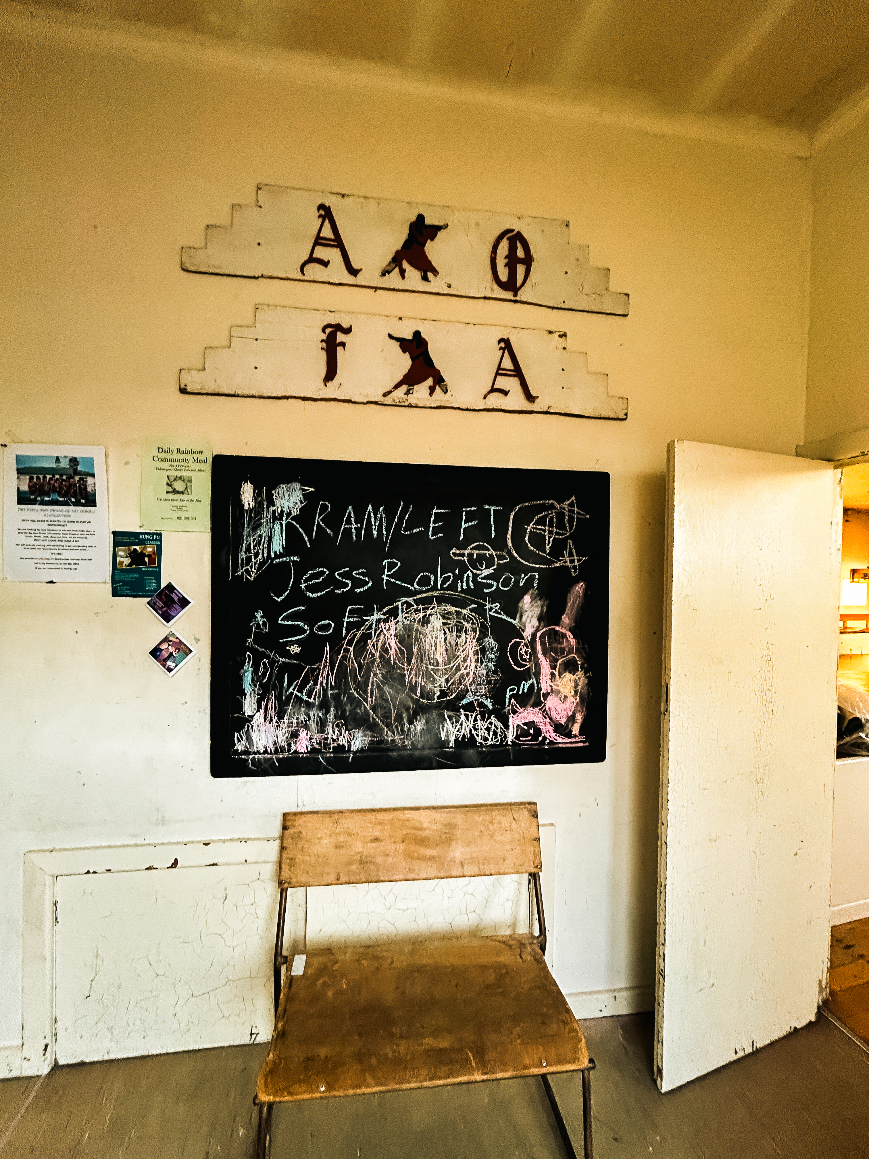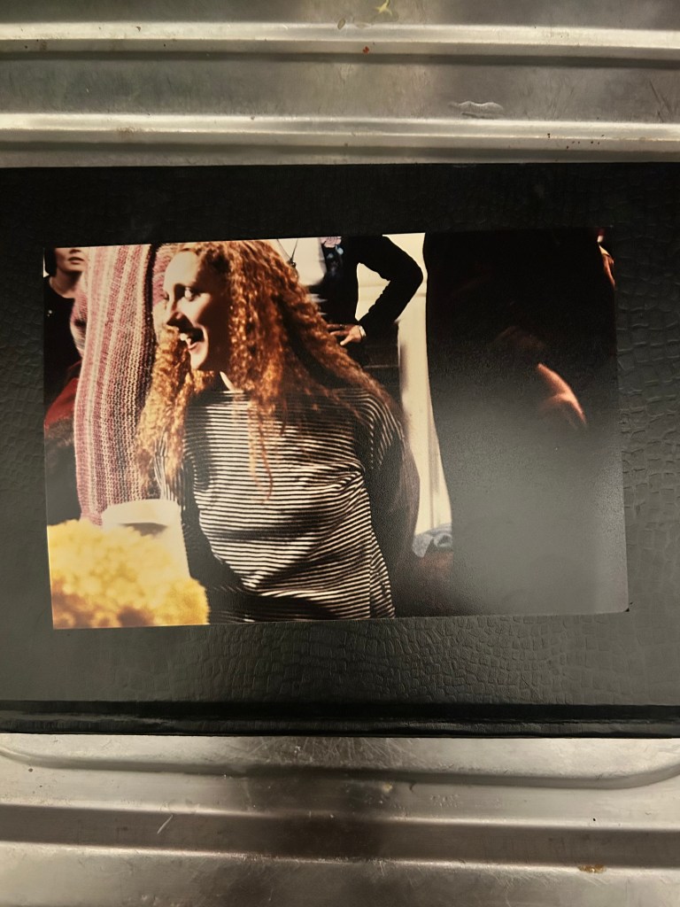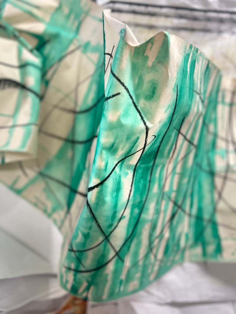 We gather in the lobby. Prepared and dressed up. A scroll of wallpaper painted with waves of pink, green, and orange and glyphs of charcoal wraps in an undulating horizontal direction from the steps to the circle, through to the snack bar, and preshow seating area. At the ticket desk merch table, volunteers draw with Vivids (felt tips) on the wrists of the attendees. Greetings and gathering.