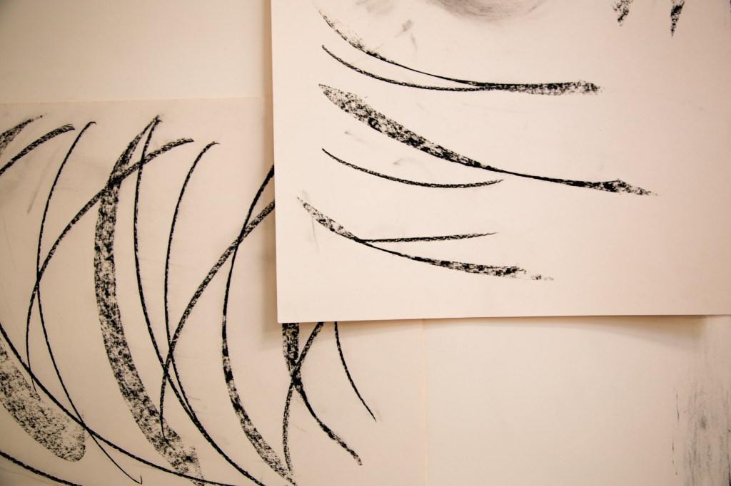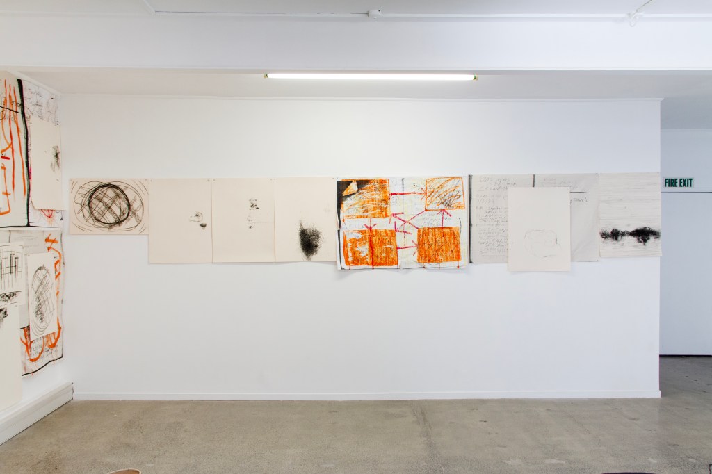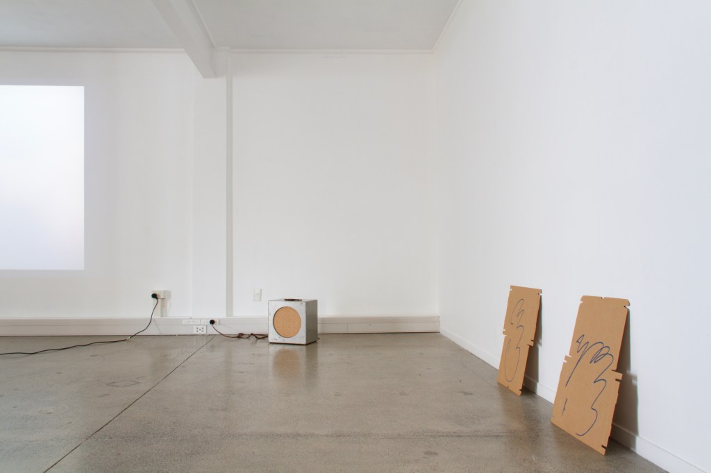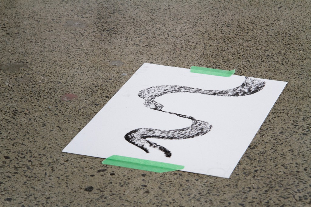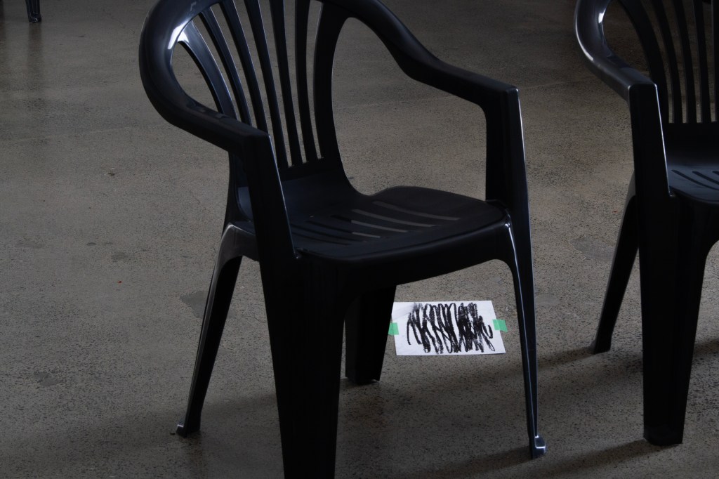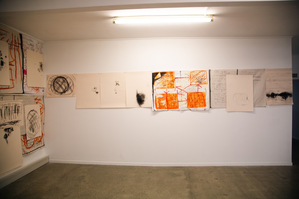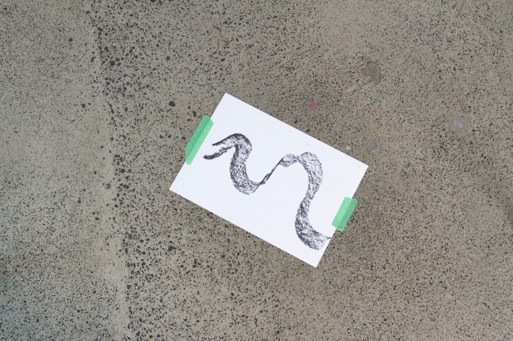 During the opening night of the exhibition Uniform collective perform a live sound performance in response to the film. The recording of this spontaneous act is then installed into the exhibition space and left as an intermittent looping presence over the duration of the exhibition. Salome Tanuvasa simultaneously performs the making of a series of gestural drawings that respond to the audience as they are submerged in the soundscape of Uniform’s performance and the visual field of the film. These drawings act as recordings of liveness which are then abandoned and left to remain in the space for the following weeks of the exhibition. The live event and choreography is rematerialised across several forms that hold space as both objects and scores for future iterations.