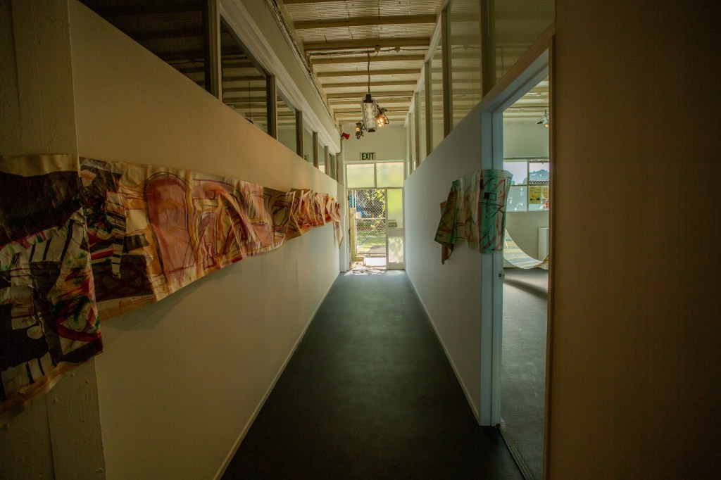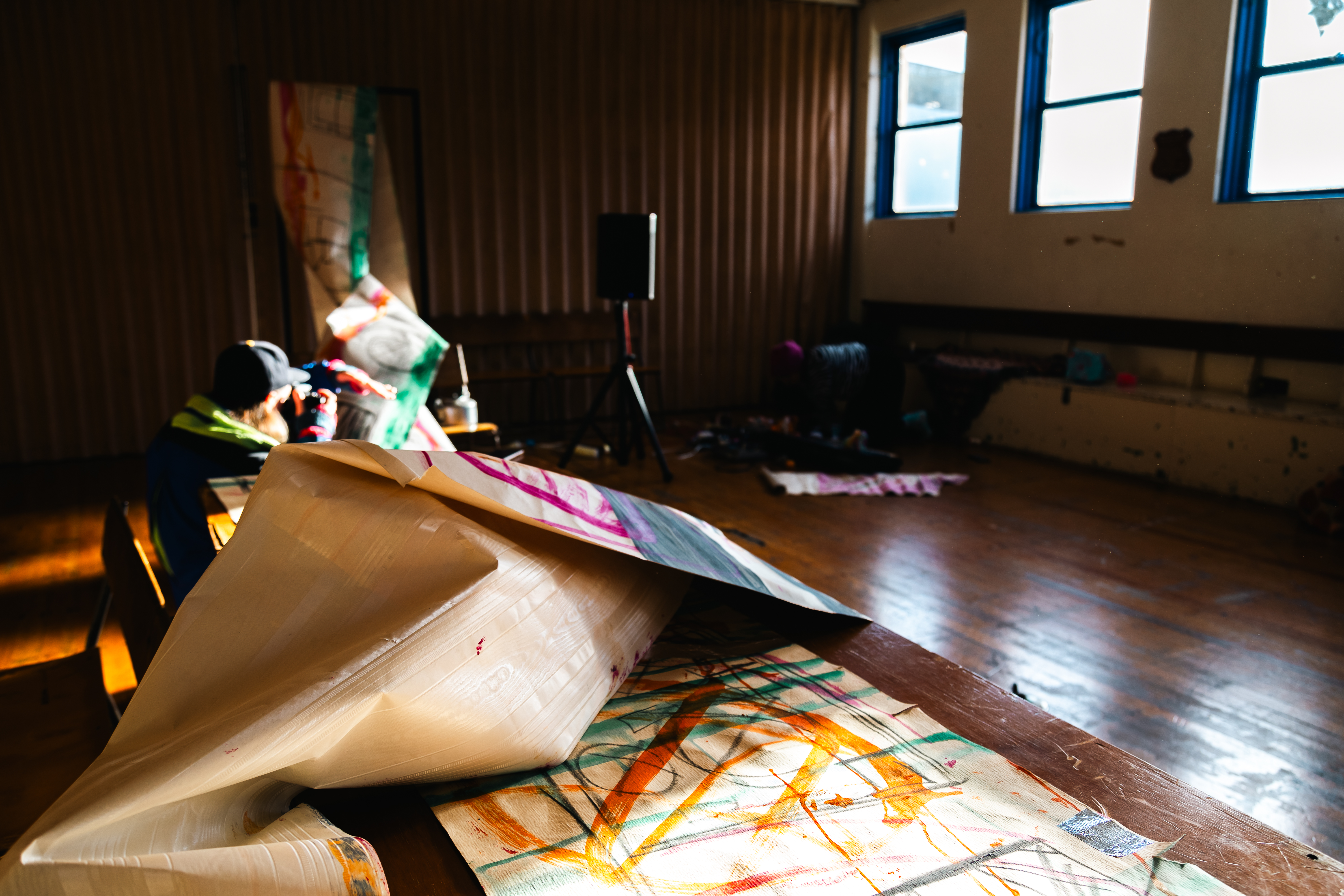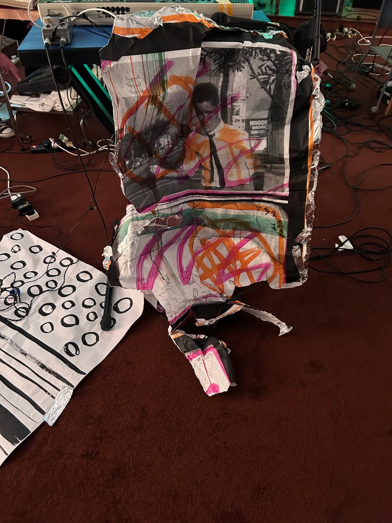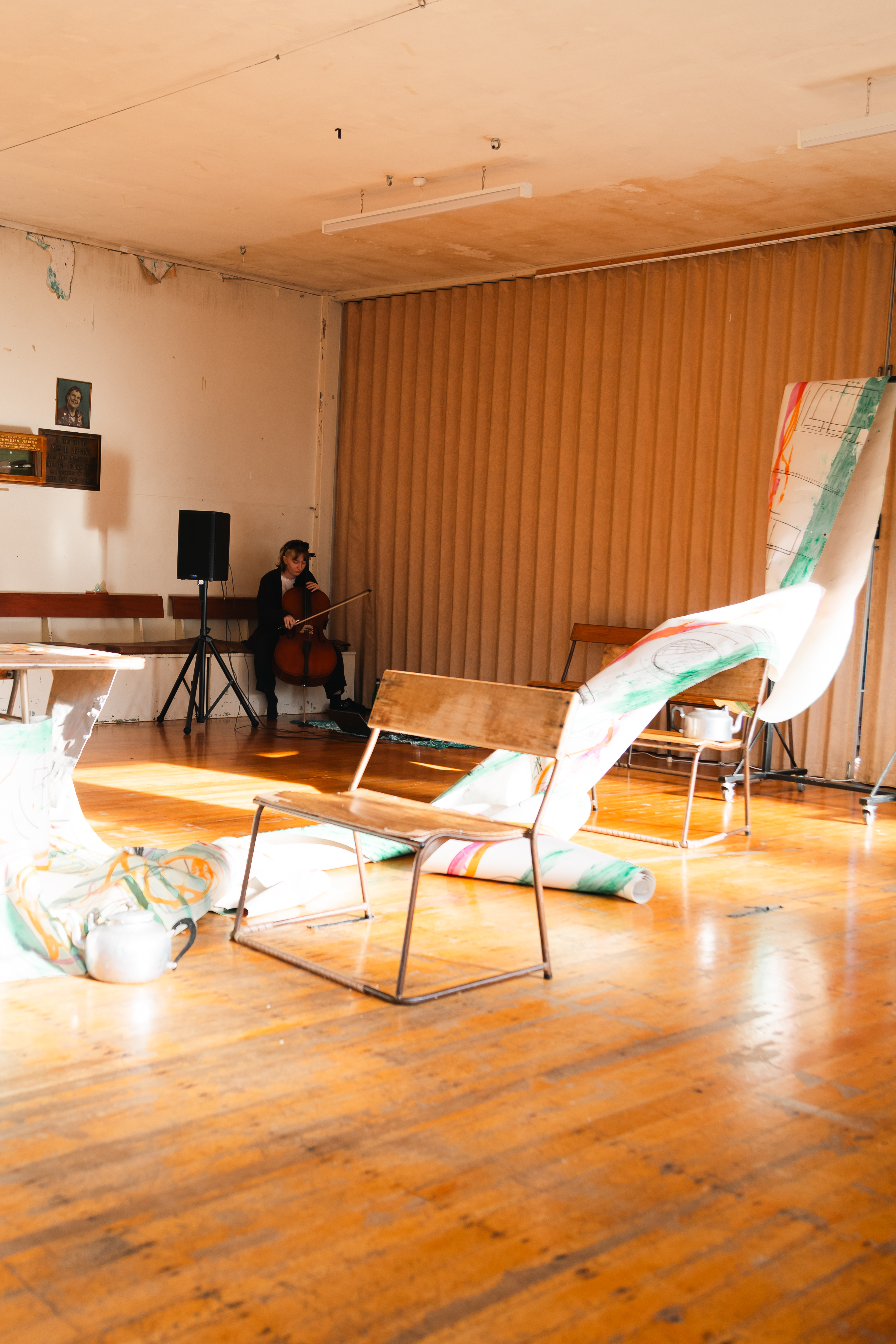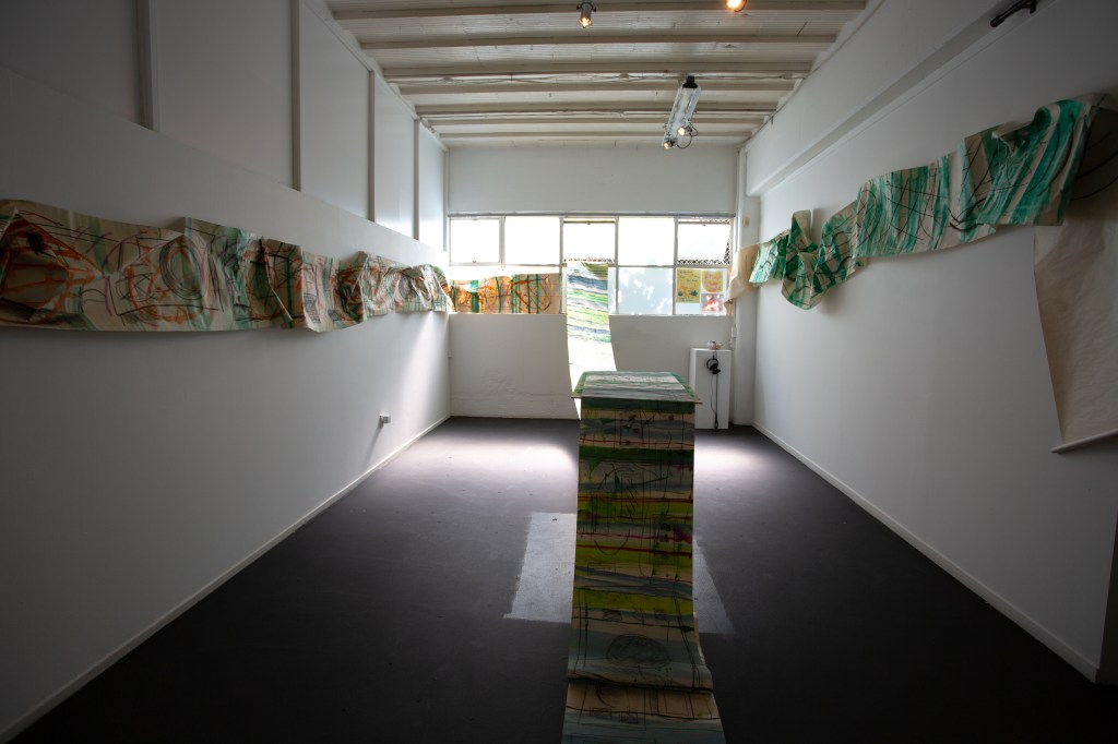 During the opening night of the exhibition Uniform collective perform a live sound performance in response to the film. The recording of this spontaneous act is then installed into the exhibition space and left as an intermittent looping presence over the duration of the exhibition. Salome Tanuvasa simultaneously performs the making of a series of gestural drawings that respond to the audience as they are submerged in the soundscape of Uniform’s performance and the visual field of the film. These drawings act as recordings of liveness which are then abandoned and left to remain in the space for the following weeks of the exhibition. The live event and choreography is rematerialised across several forms that hold space as both objects and scores for future iterations.