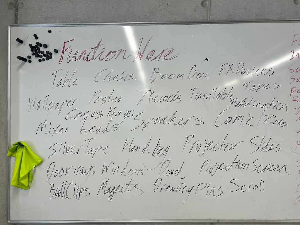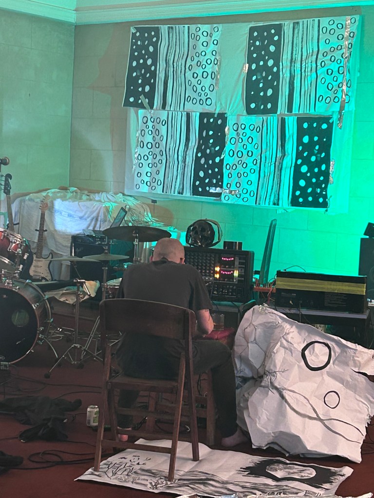 Focusing on the material potential of temporary dwelling in social spaces has led me to look at what I bring to the table. A key material in this research is sound. In Sonic Possible Words through a consideration of sound as material the theorist and sound art practitioner Salomé Voegelin has established a phenomenology of listening in which she considers sound as a way of knowing and experiencing the world. Voegelin engages with philosopher Jean-Luc Nancy’s positioning of listening as a way of being. In the text Listening, Nancy establishes listening as tied to his philosophy of self as resonance.[1] Sound moves beyond the semantic transmission of meaning and resounds with the listener. Listening immerses the hearer in sound; consequently, sound is understood as a contingent subjective material. For Voegelin the resonance of listening, with its openness to a shifting continuum of vibration and relation, builds sonic possible worlds. Through my installation and drawing practice I have been exploring how the sonic possible worlds resound with are a lead to the audio-visual events I share.