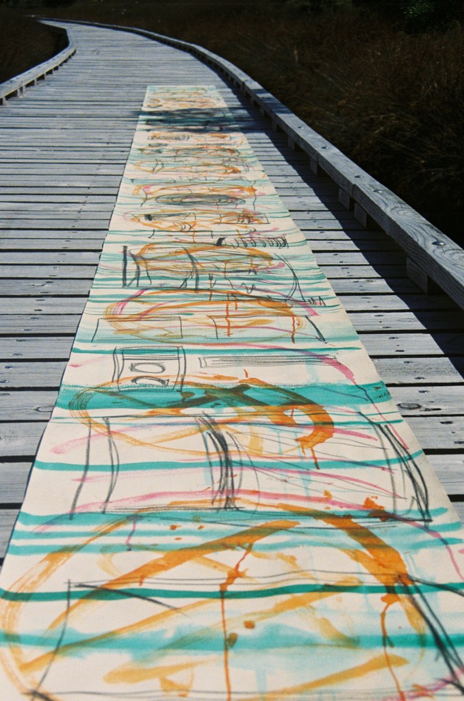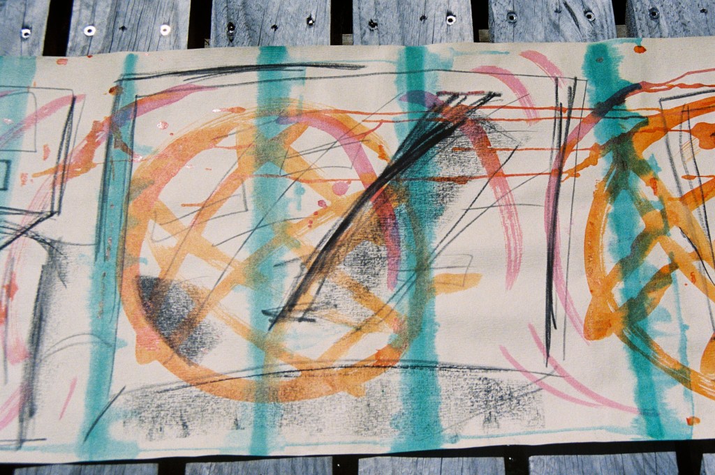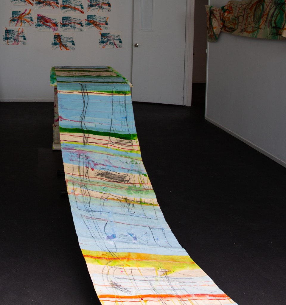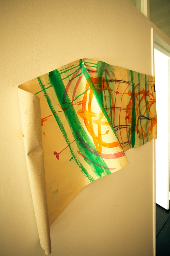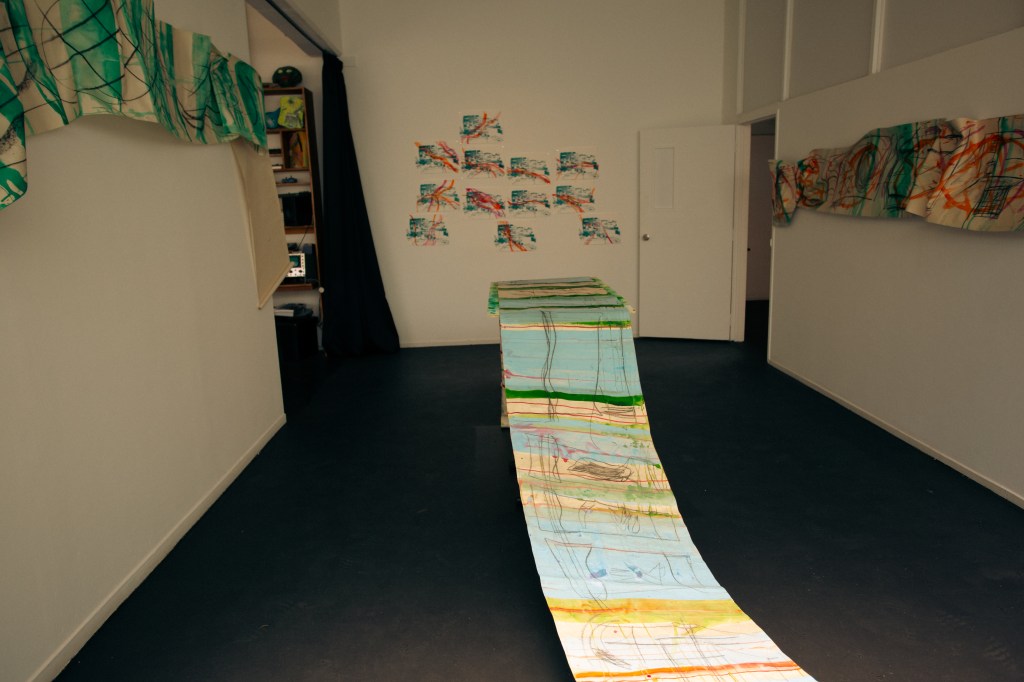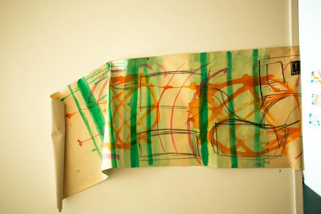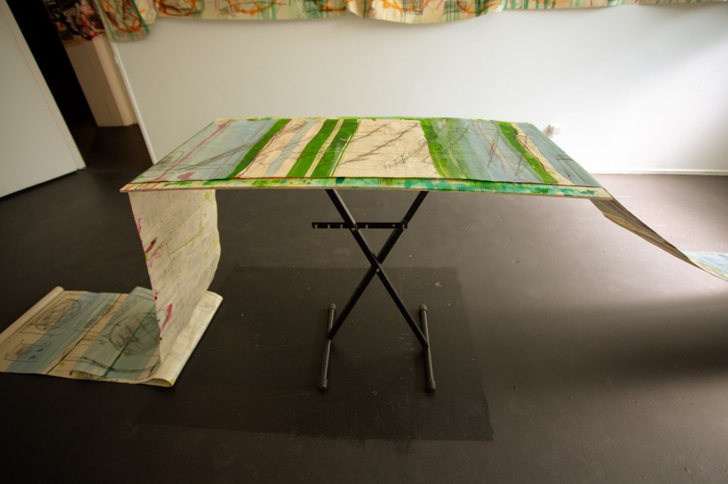 Durational process. A section of wallpaper lining paper is rolled out across the length of the formica dining table each day. Pencil lines mark out the rolling paper. The painted with bands of water, interior chalked house paint (grey blue) and concentrated ink (green, orange, red)