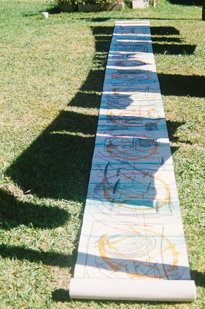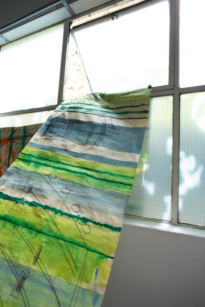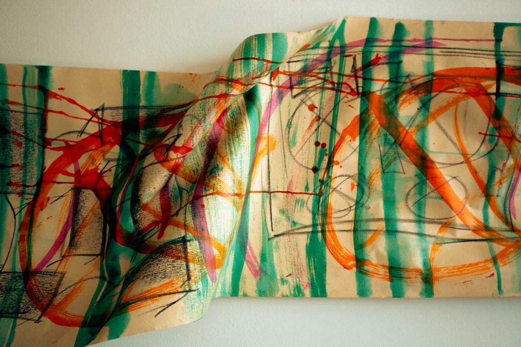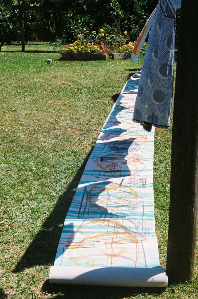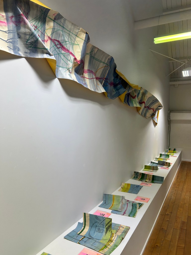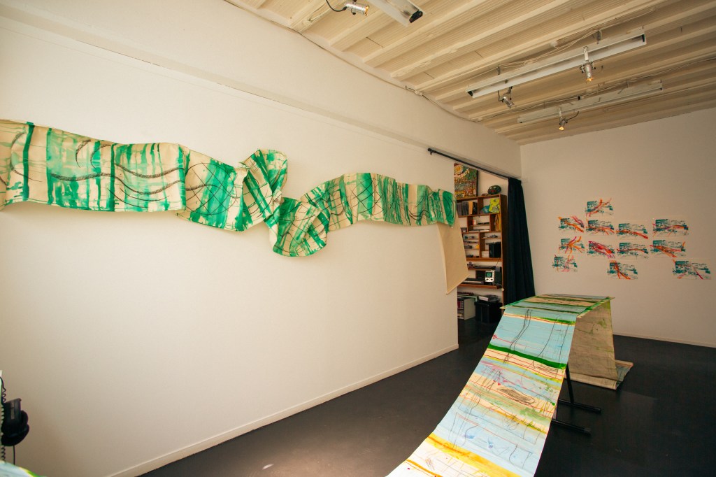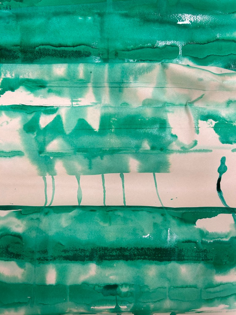 Durational process. A section of wallpaper lining paper is rolled out across the length of the formica dining table each day. Pencil lines mark out the rolling paper. The painted with bands of water, interior chalked house paint (grey blue) and concentrated ink (green, orange, red)