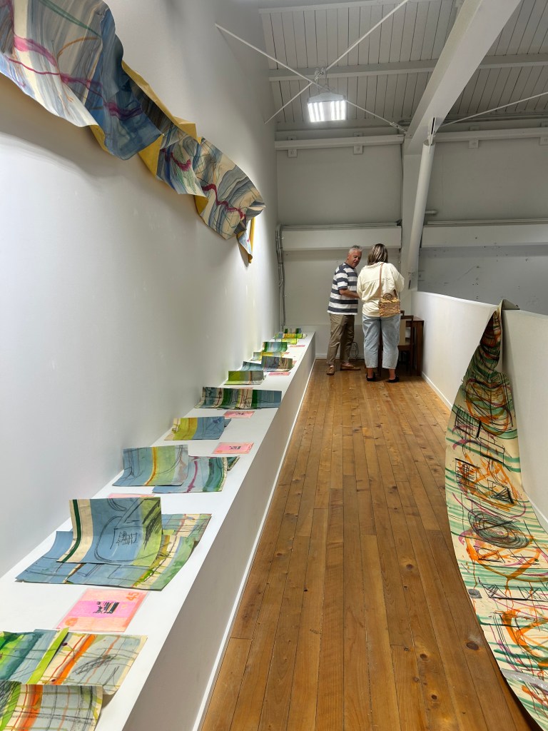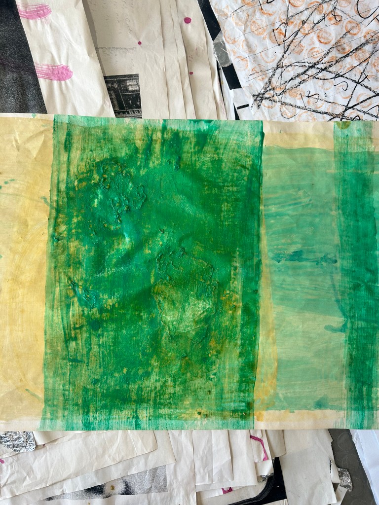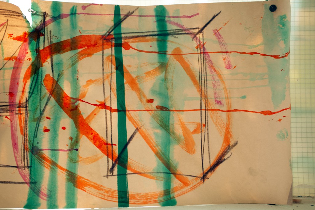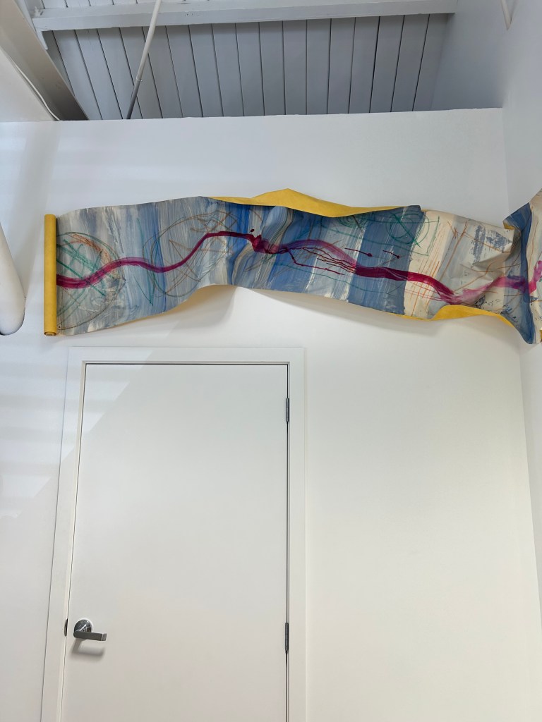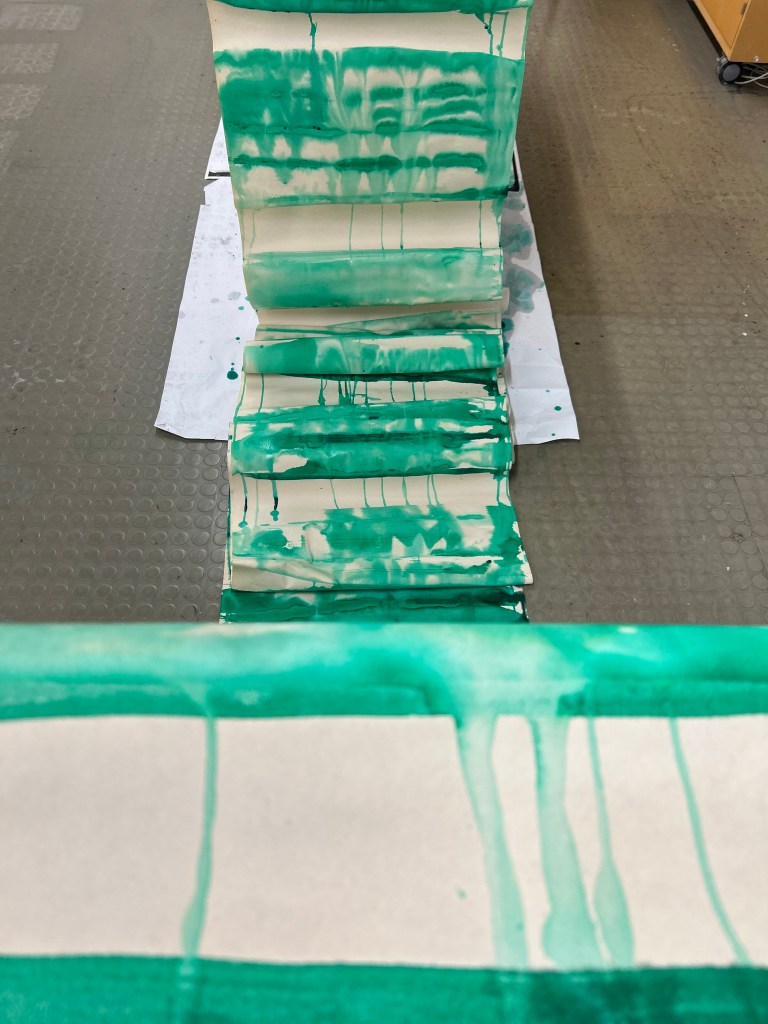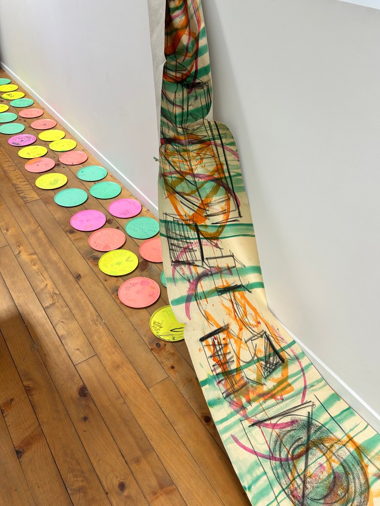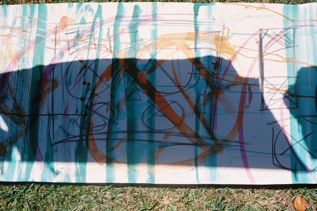 Durational process. A section of wallpaper lining paper is rolled out across the length of the formica dining table each day. Pencil lines mark out the rolling paper. The painted with bands of water, interior chalked house paint (grey blue) and concentrated ink (green, orange, red)