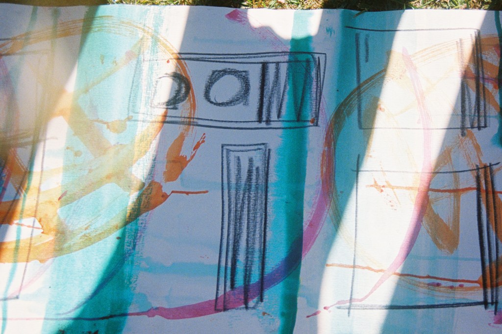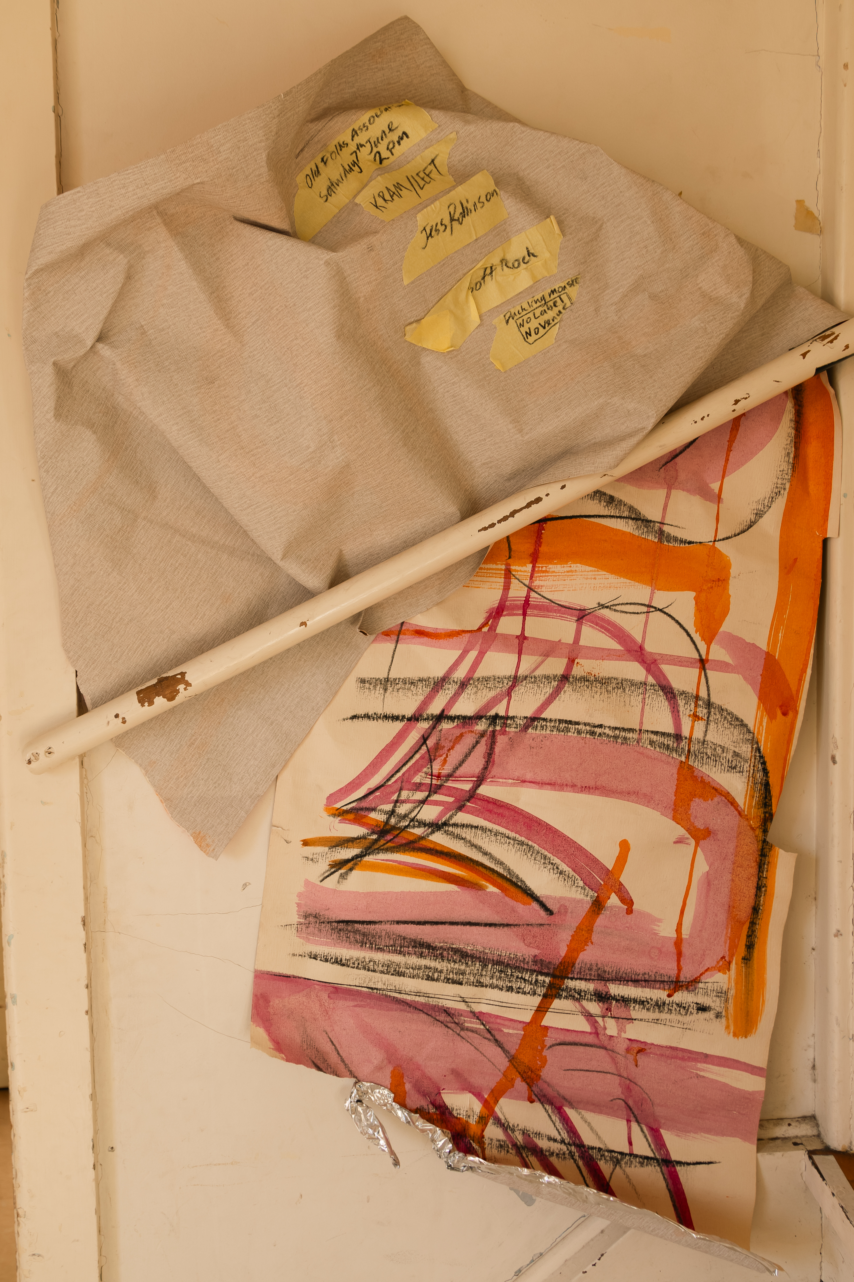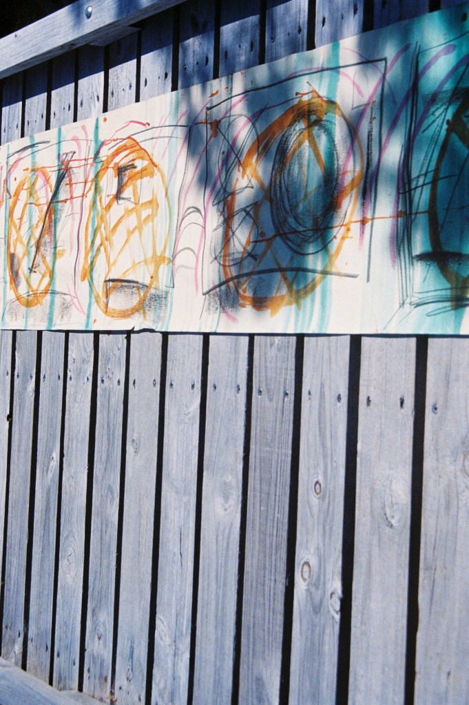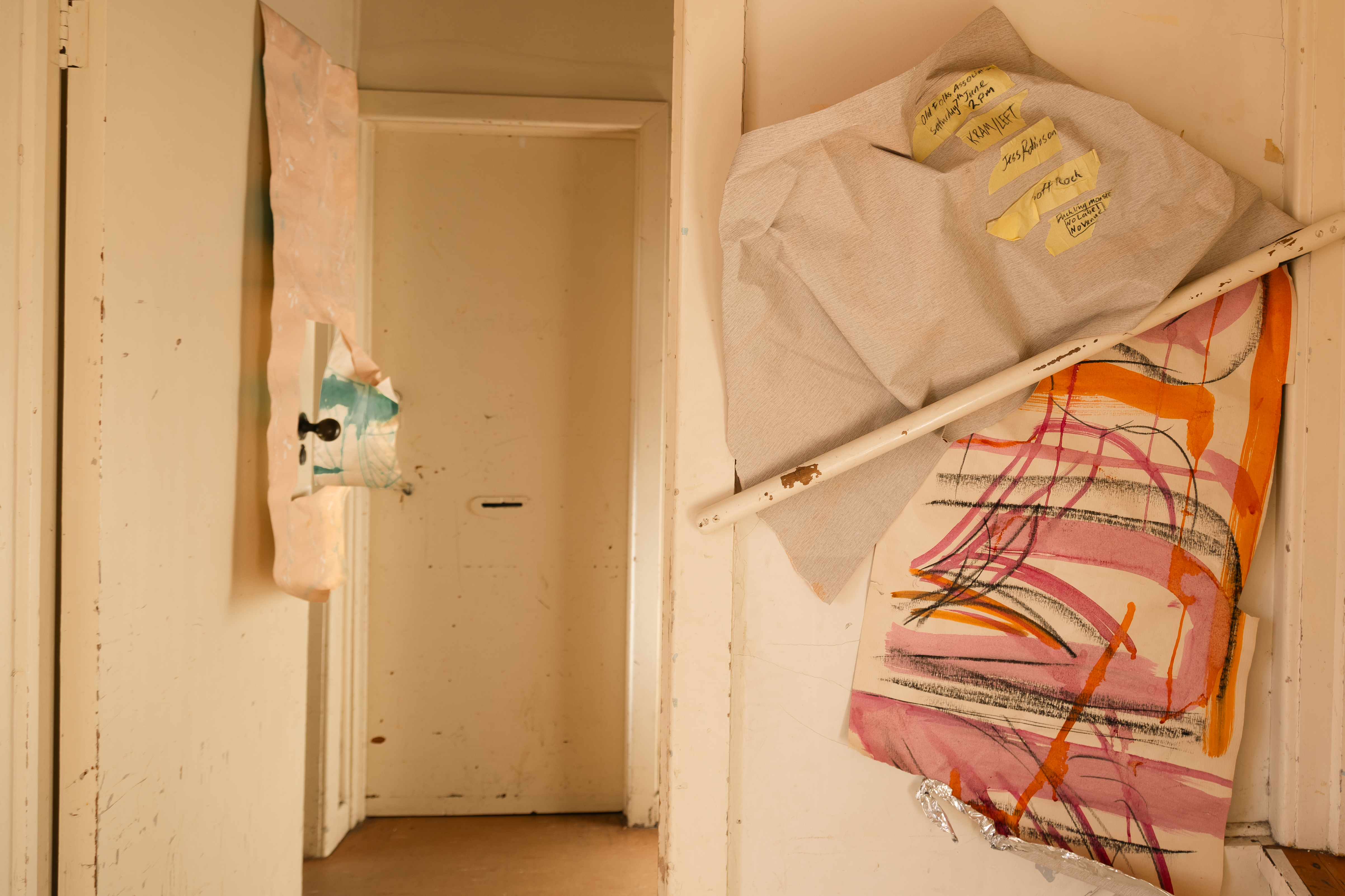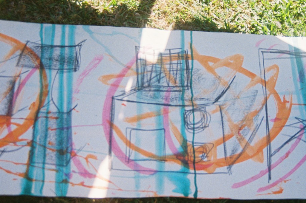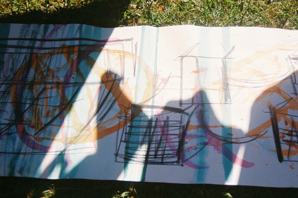 Wallpaper works with first marks. Colour-field ground. Double sided. Four pieces.Ranch Slider (minor changes to rental) Sketchy corner. Using masking tape and pencil to document and produce maquettes. The Puddle (minor changes to rental)Bringing the elements I’ve working on in to play with one another. I take an asemic notation of the films language of light.
