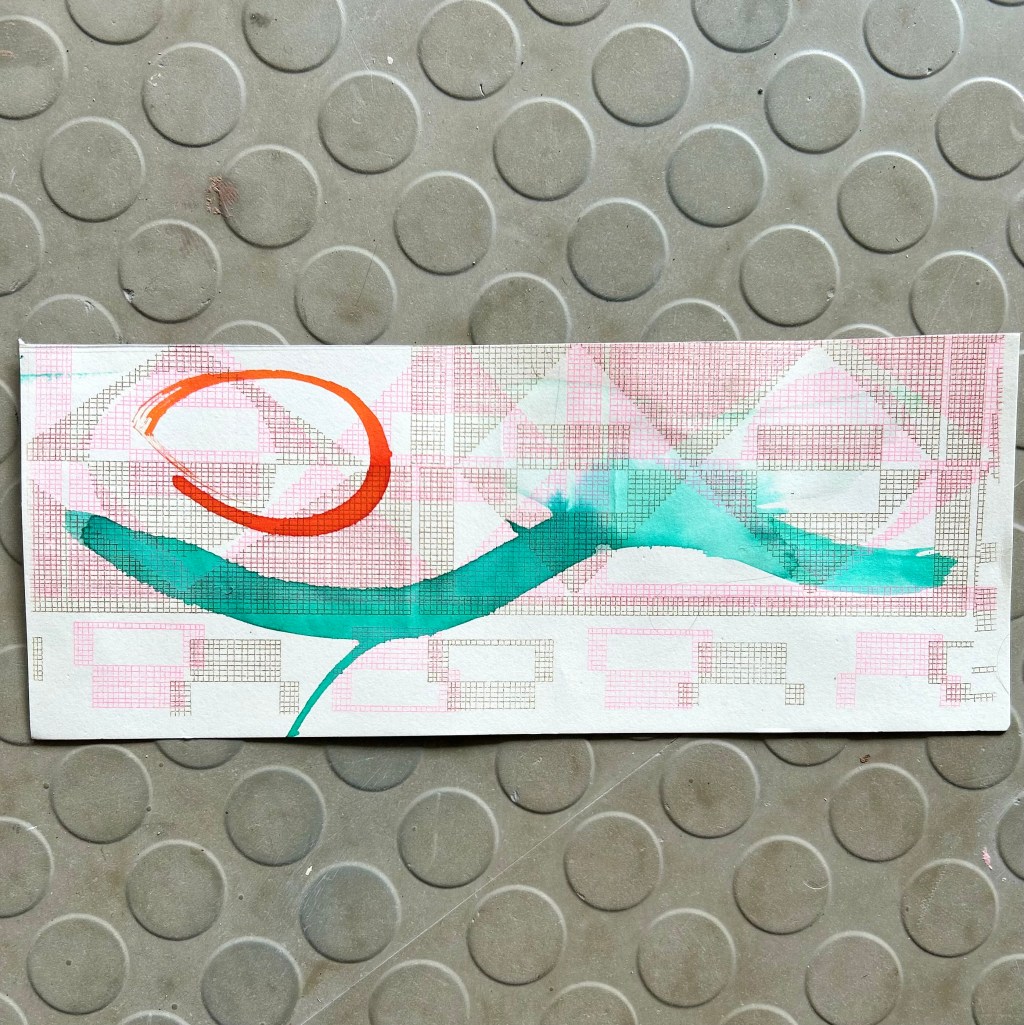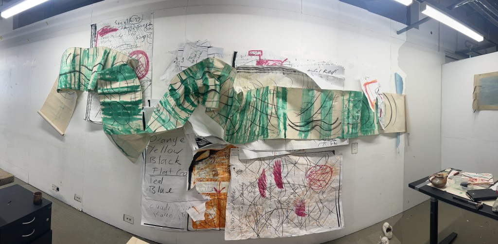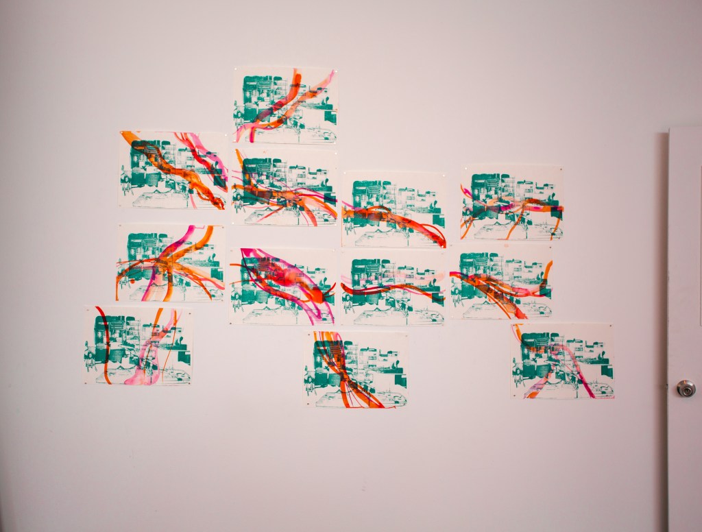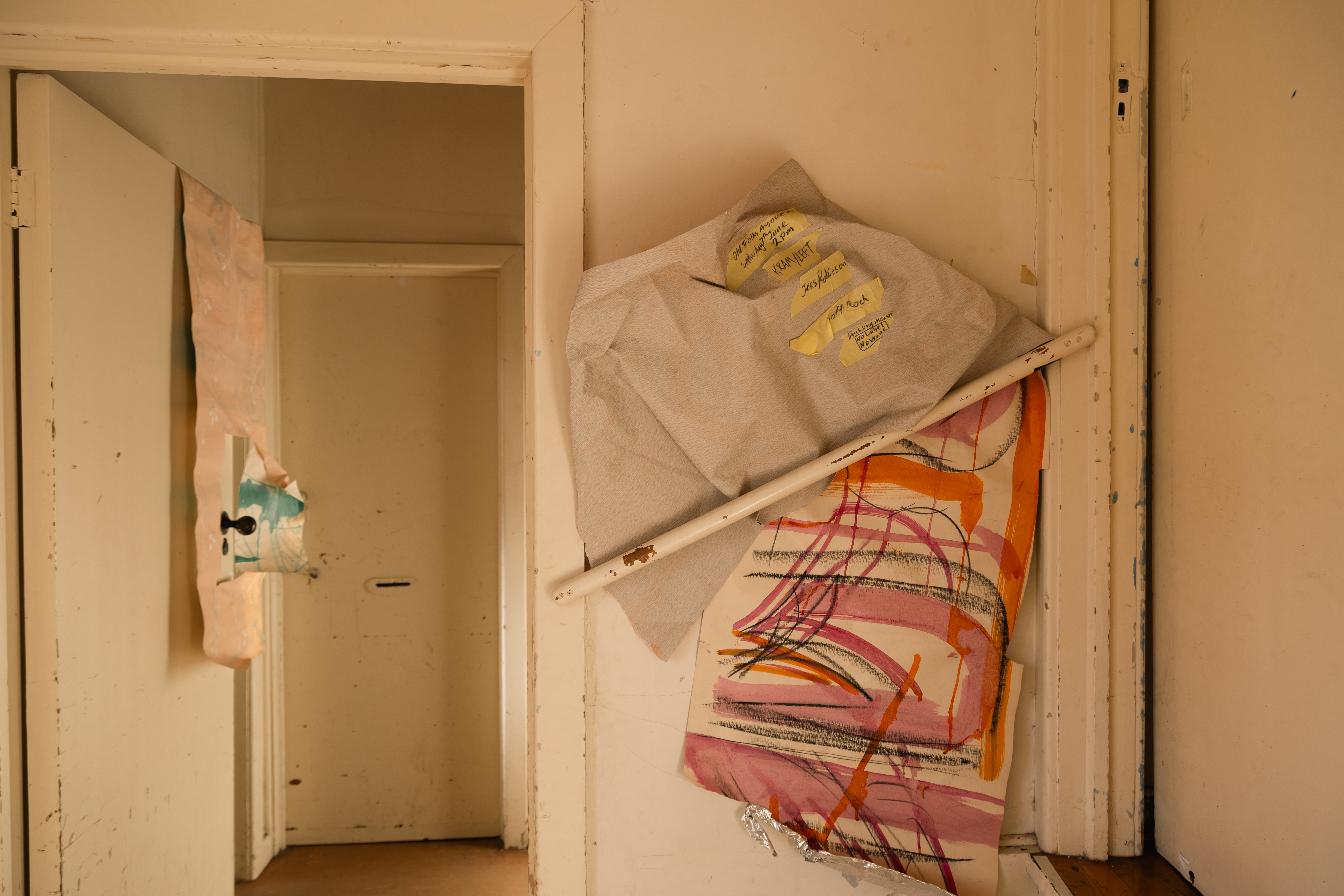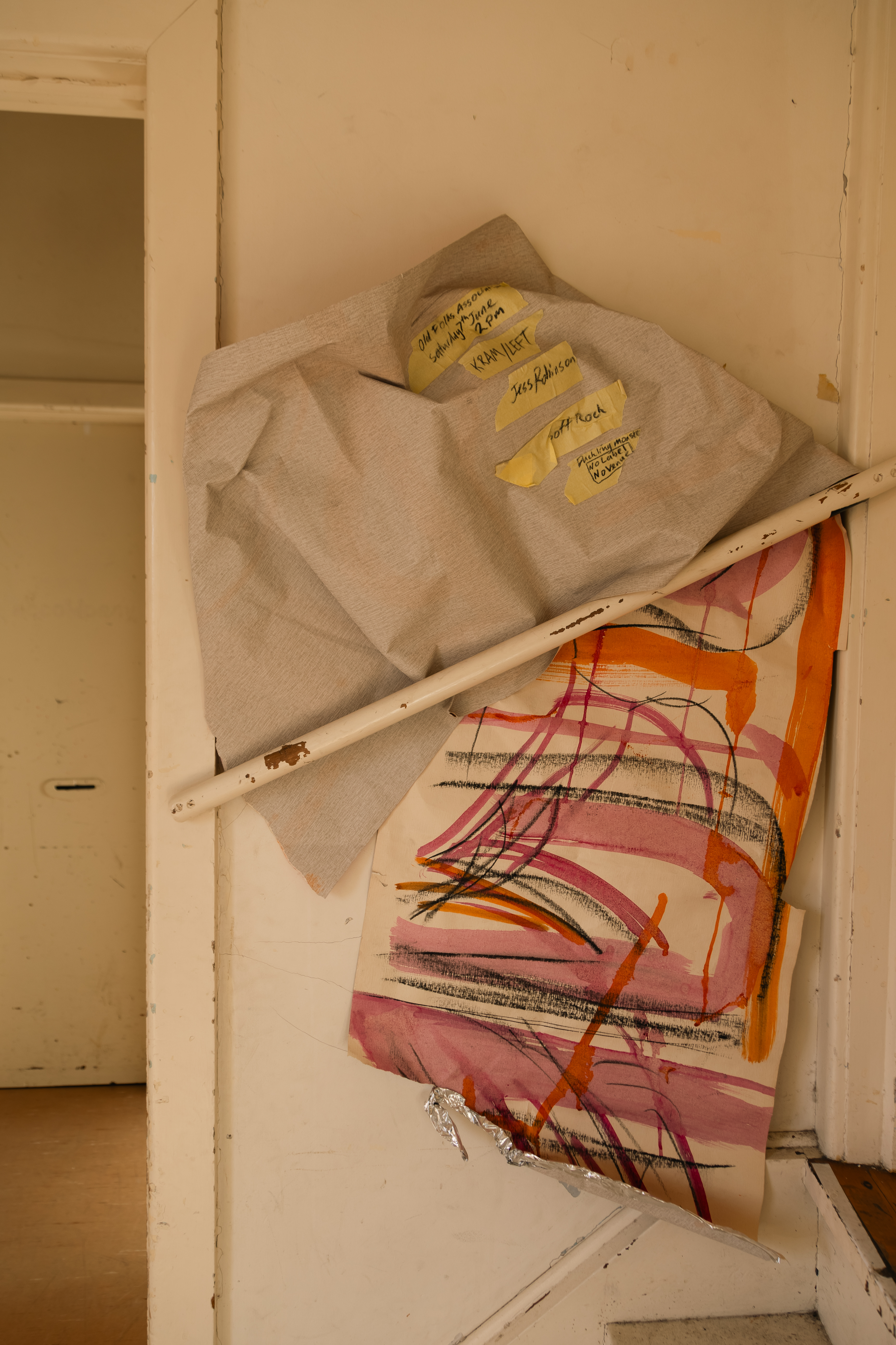 Wallpaper works with first marks. Colour-field ground. Double sided. Four pieces.Ranch Slider (minor changes to rental) Sketchy corner. Using masking tape and pencil to document and produce maquettes. The Puddle (minor changes to rental)Bringing the elements I’ve working on in to play with one another. I take an asemic notation of the films language of light.