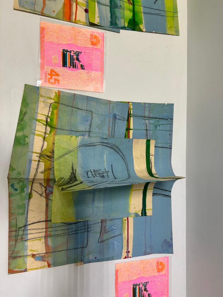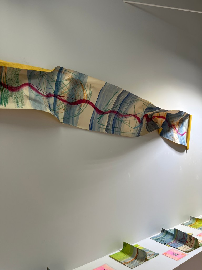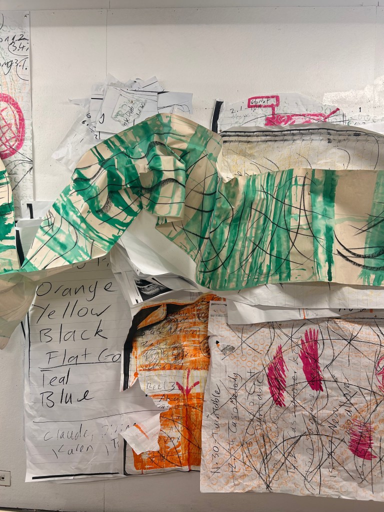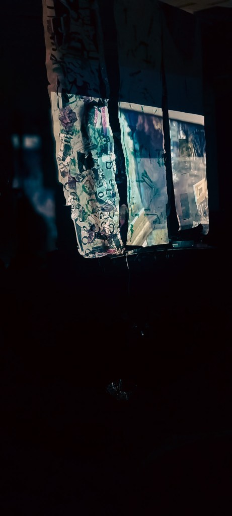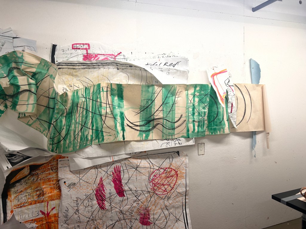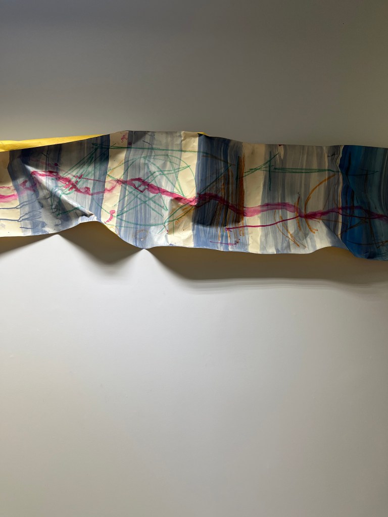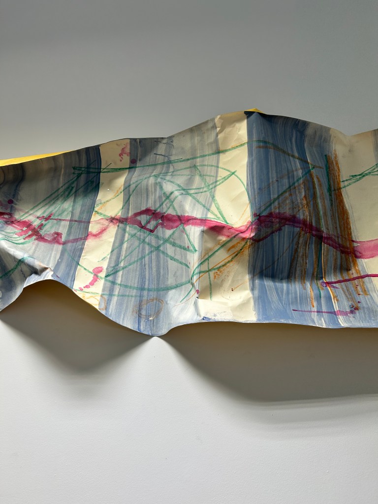 Drawings separated and rehung. Emphasis on height on wall and 3D relationship to the wall surface. Paper and foil tape textures of crumpled and torn. Shadow emphasis using strong light from OHP. Adding a projected shadow layer. Lint is Listening. Working with some details. Repeat drawing with layering photocopy of pencil and ink with ink then paint. Corner experiment of foil tape and paper on wall.Artspace deinstall. Floor work with folds and shadows of the fall.