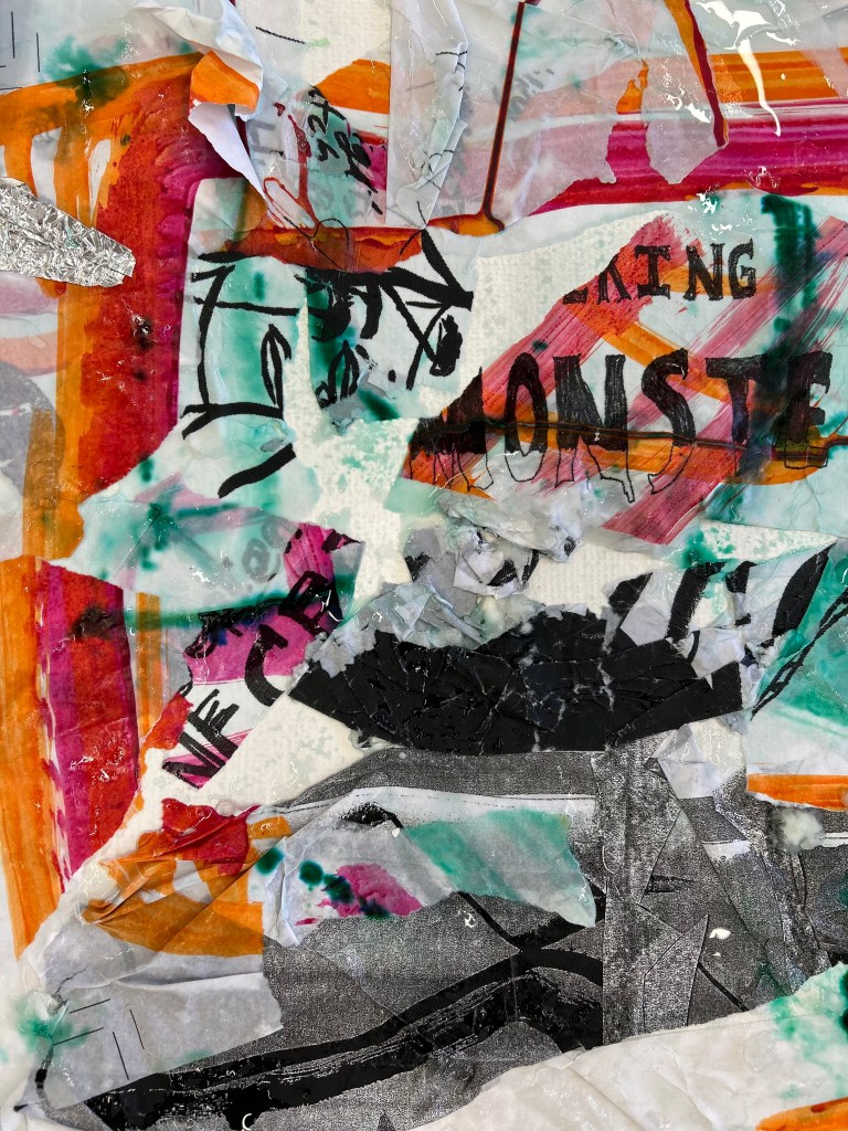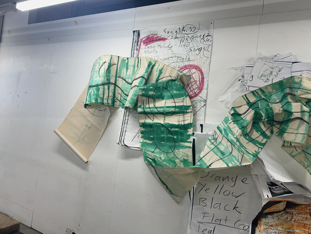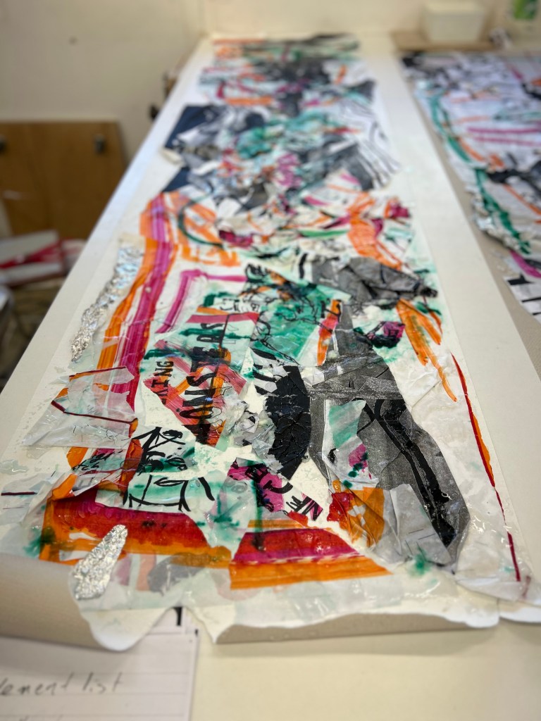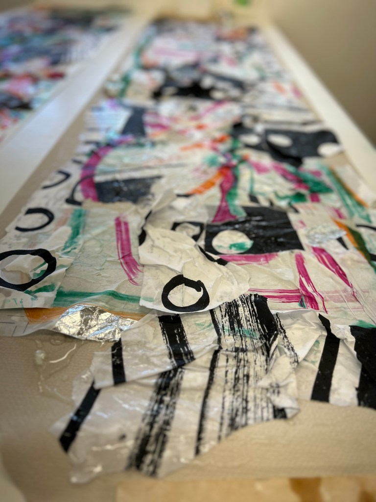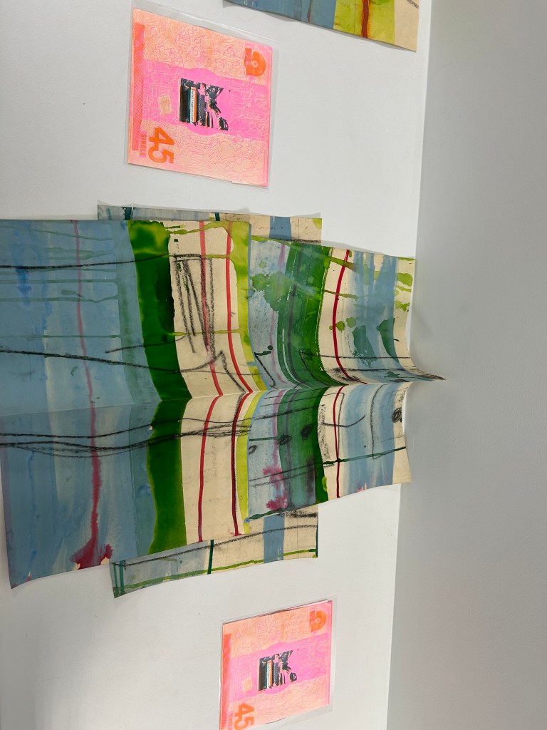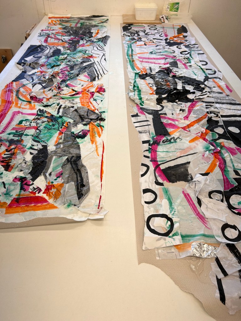 Drawings separated and rehung. Emphasis on height on wall and 3D relationship to the wall surface. Paper and foil tape textures of crumpled and torn. Shadow emphasis using strong light from OHP. Adding a projected shadow layer. Lint is Listening. Working with some details. Repeat drawing with layering photocopy of pencil and ink with ink then paint. Corner experiment of foil tape and paper on wall.Artspace deinstall. Floor work with folds and shadows of the fall.