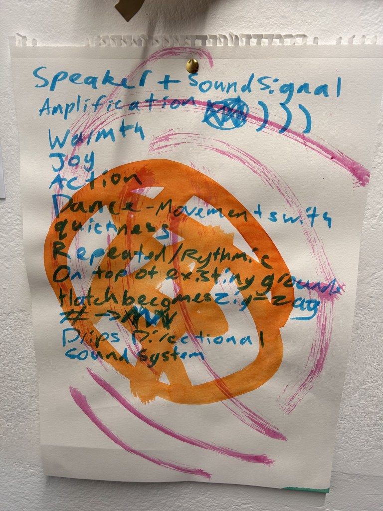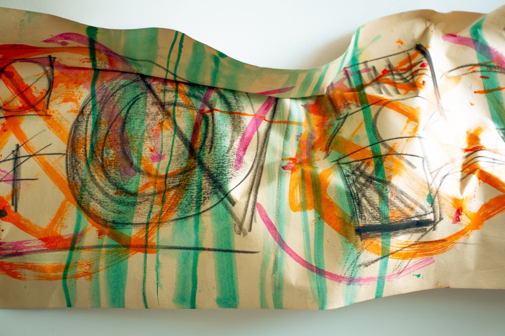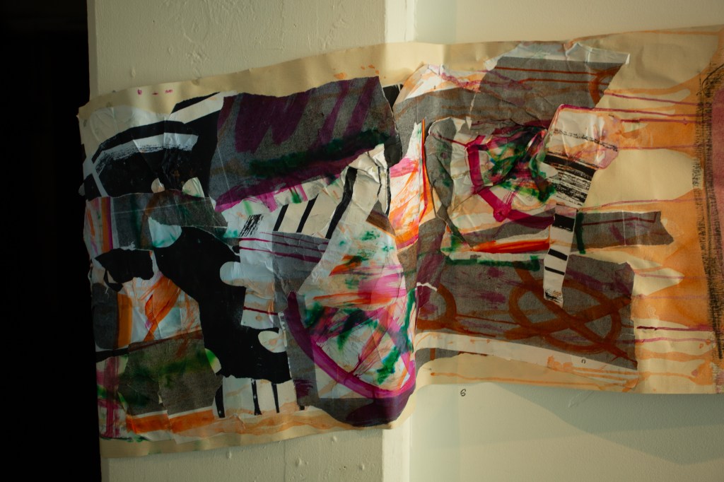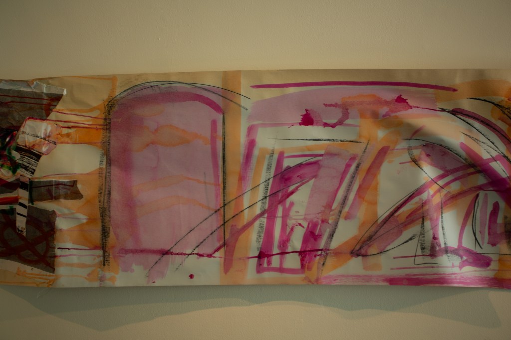With radical attentiveness carried in listening and drawing, encounters reverberate across the artist’s noise-table. Quick gestures worked in tinted cellulose glue, beeswax crayon, and saturated ink express a relationship to the lively moments of voice and distortion in Ducklingmonster’s improvised sound performances. The material layers of Waves Between invite contemplation of the waves between electromagnetic bodies and fields in the permeable membrane of Stepdown.
