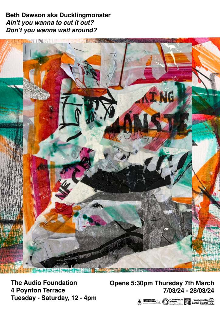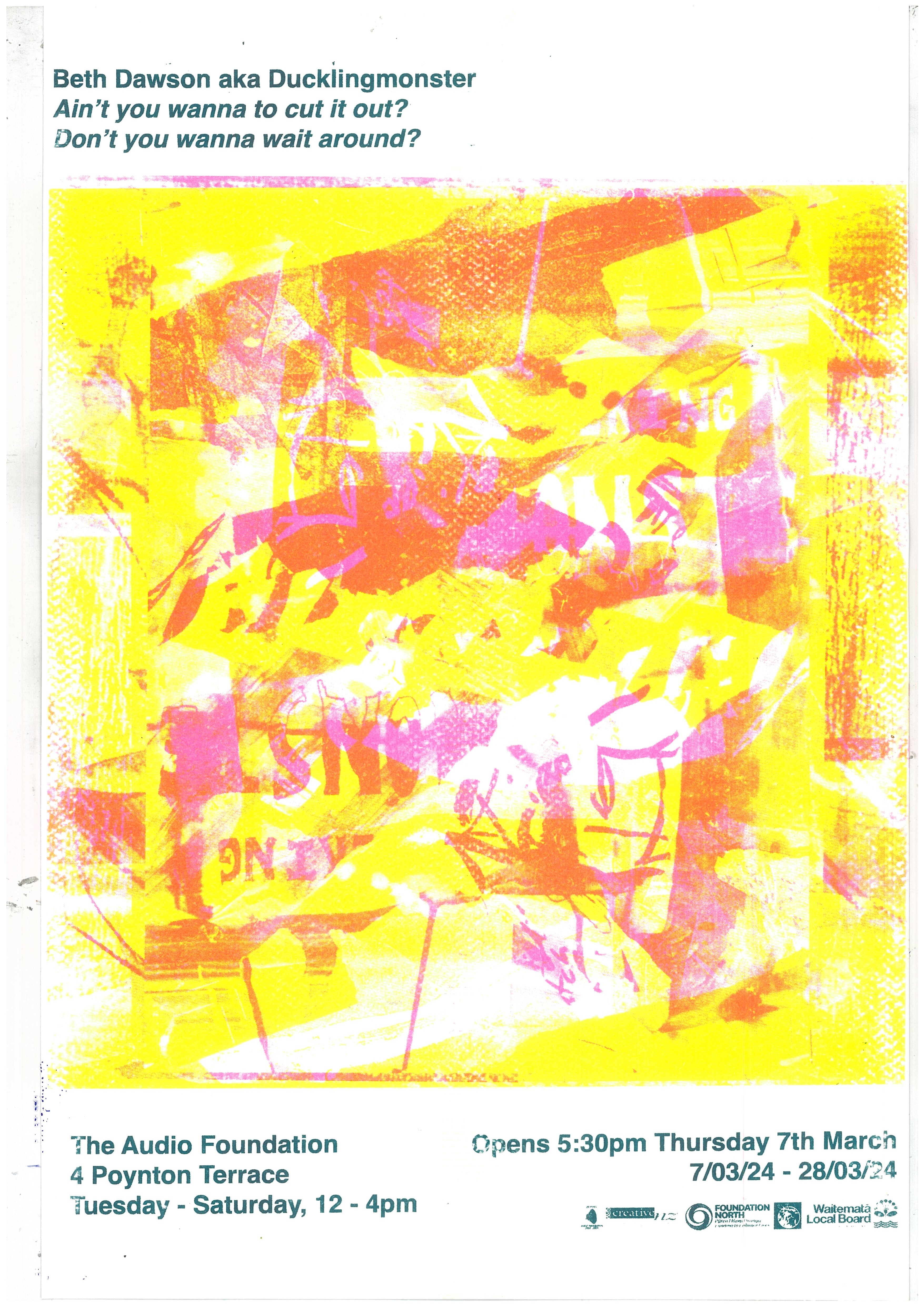“Please join us to celebrate the opening of Ain’t you wanna cut it out? Don’t you wanna wait around?, a new exhibition by stalwart of sonic arts landscape, Beth Dawson (aka Ducklingmonster), which unfurls across the gathering spaces of the Audio Foundation.