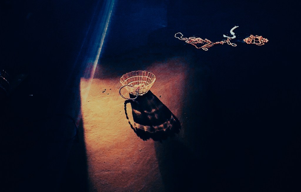 Playing with gesture in object relationship with a bowl of necklaces. The performance of getting ready to “go out” when we are “staying in”. Sound is a close percussive of the bowl and beads with a room sound of a slow organ melody. Elements of time echo in the sound and image. I placed a slide over the camera to give a frame and colour filter that heightens the fantasy of the film image. Sense of overflowing. When things overflow they change. Abundance.