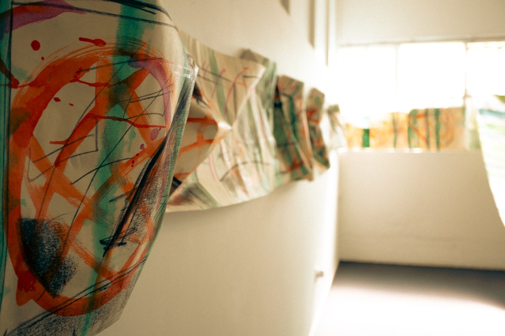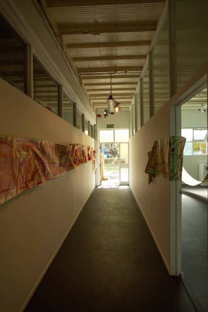 The sculptural repetition of layering and hanging these images created the appearance of animated frames moving throughout the space. The wallpaper and paper had a cohesion that confidently demarcated the area of the installation. I felt that people situated within this defined space experienced being folded into an animation. The functional objects of the trolleys holding the tools used to construct the installation illustrates my presence in the making and also places the audience “behind the scenes” of the artwork. With these installation decisions I was seeking to express a social occupancy.