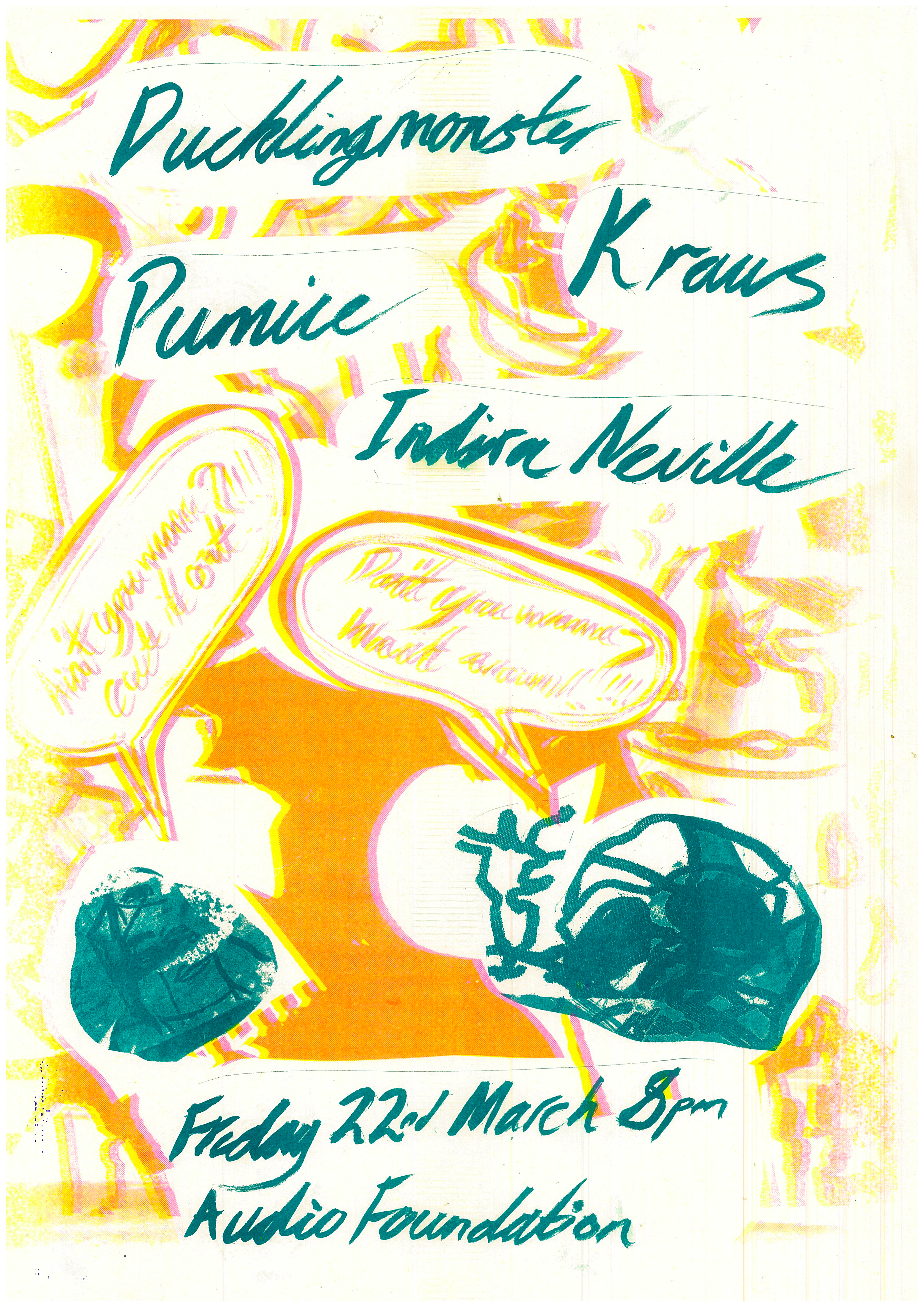 Live performances by Ducklingmonster, Kraus, Pumice and Indira Neville Friday 22 March, 8pm @ Audio Foundation” Exhibition press release