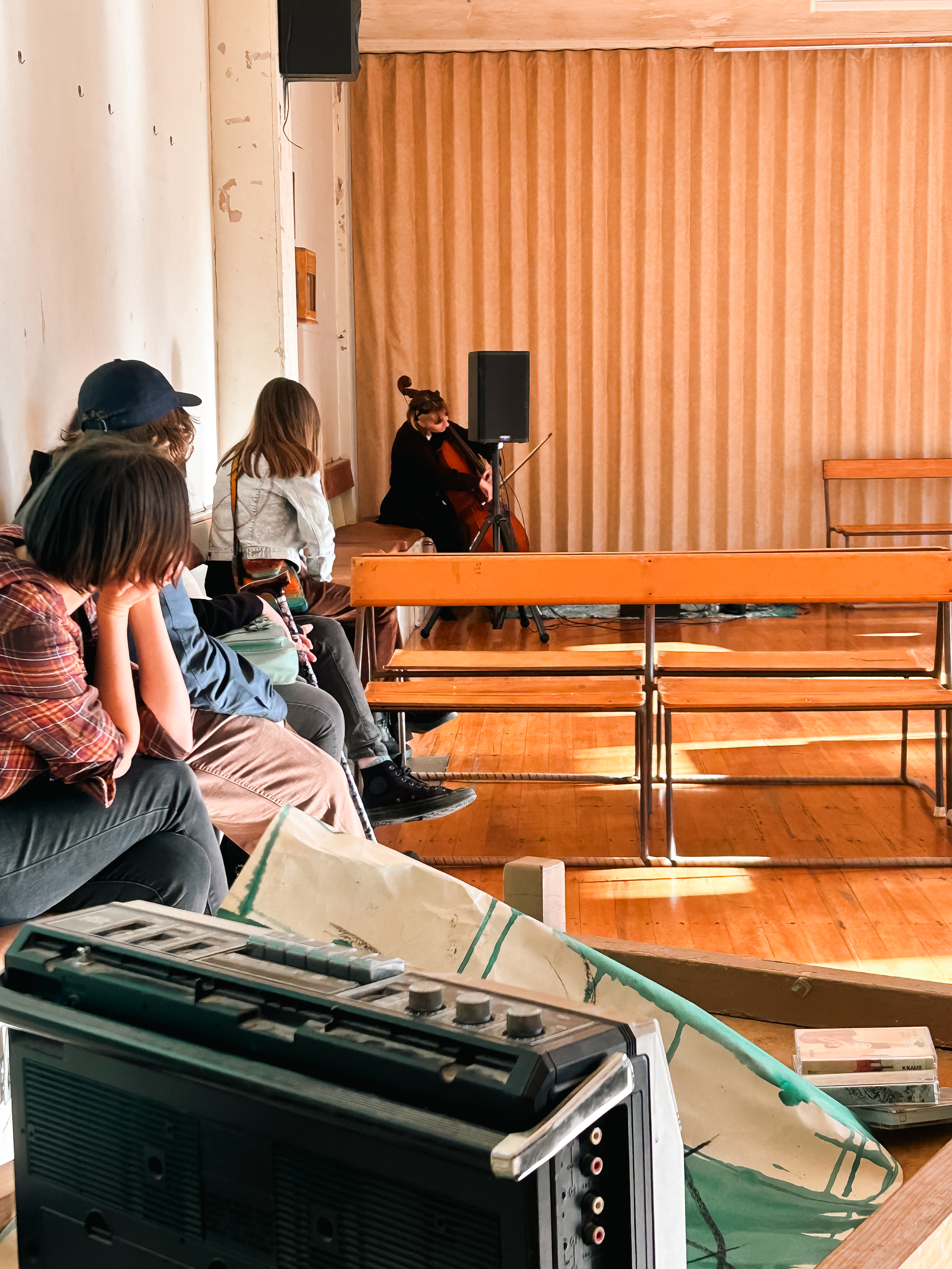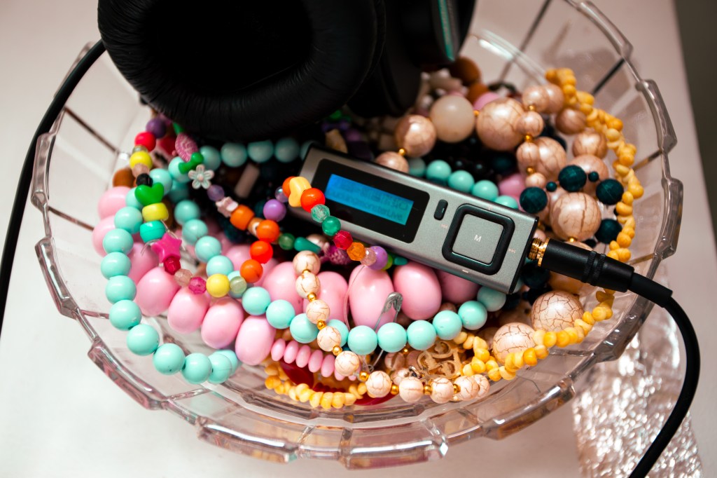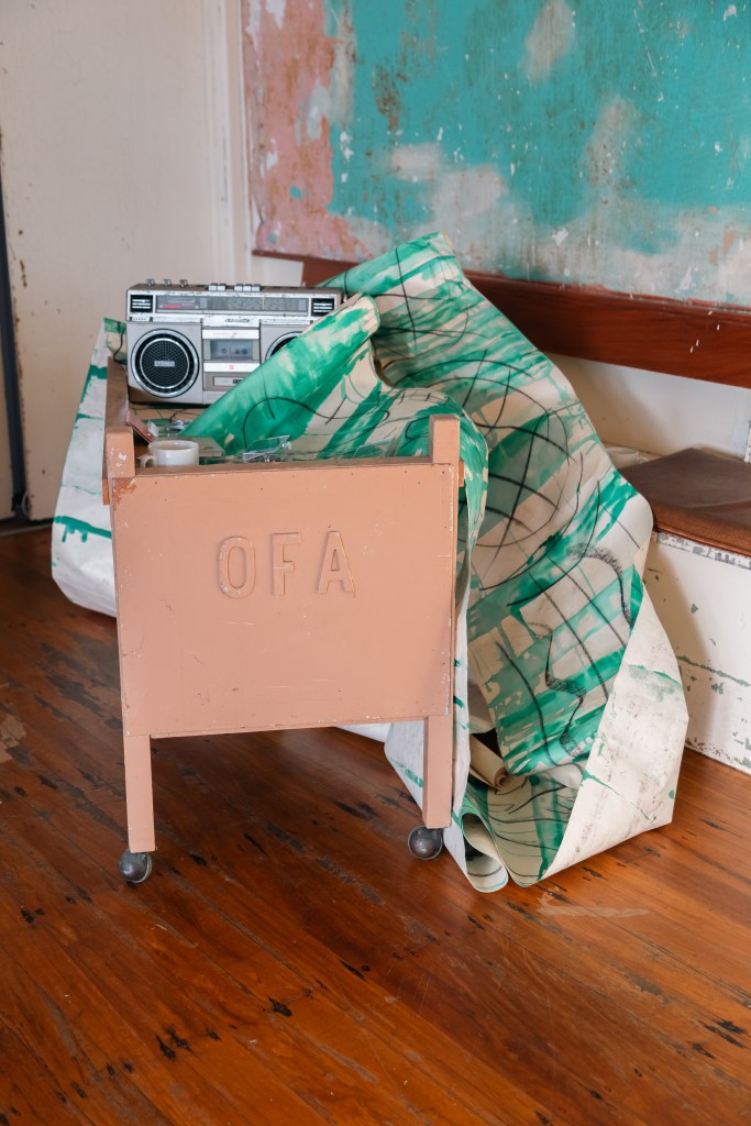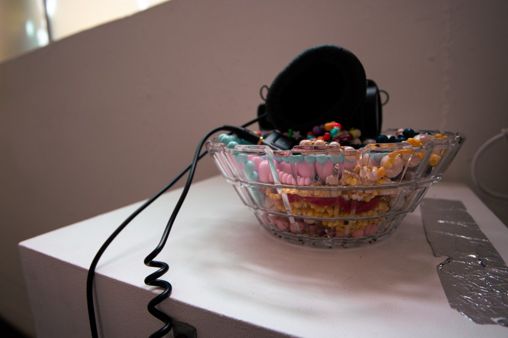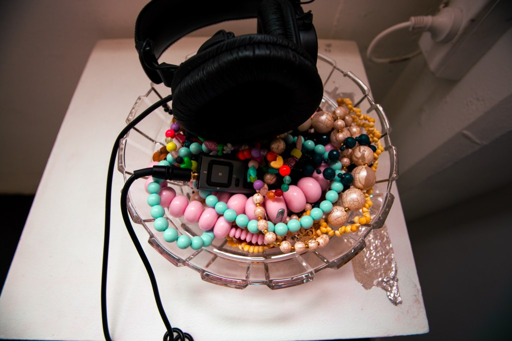 A plinth holds a vanity case next to the comfy couches and row of rehoused 1920s cinema seats. An abundance of plastic beads and little glass nail polish bottles provide a colourful nest for headphones connected to a wireless radio pack. The vanity case has been listening.