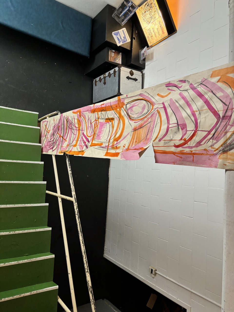Drawn while watching my video series Going Out and Staying In , ‘Dream Stream’ is a shifting exploration of interior spaces bringing together the liminal space of the Audio Foundation corridor between the projection room, gallery and garden with the online video site and the apartment interior of the documented performance. The warm duotone of orange and pink abstracts the mise-en-scēne of the apartment interior such the arch window frames and the table-top lamp etc. Across this ink, the charcoal drawing notates the performance score with my symbols for the electronic musical devices such as the diagonal lines intersected to represent the levels on my mixer or the imagined direction lines of the sound waves. Stretched and scrunched down the length of the corridor beginning with a paper-mache tail in the projection room and ending with a falling curl at the door to the garden the drawing travels with the viewer/audience through the transitional space.