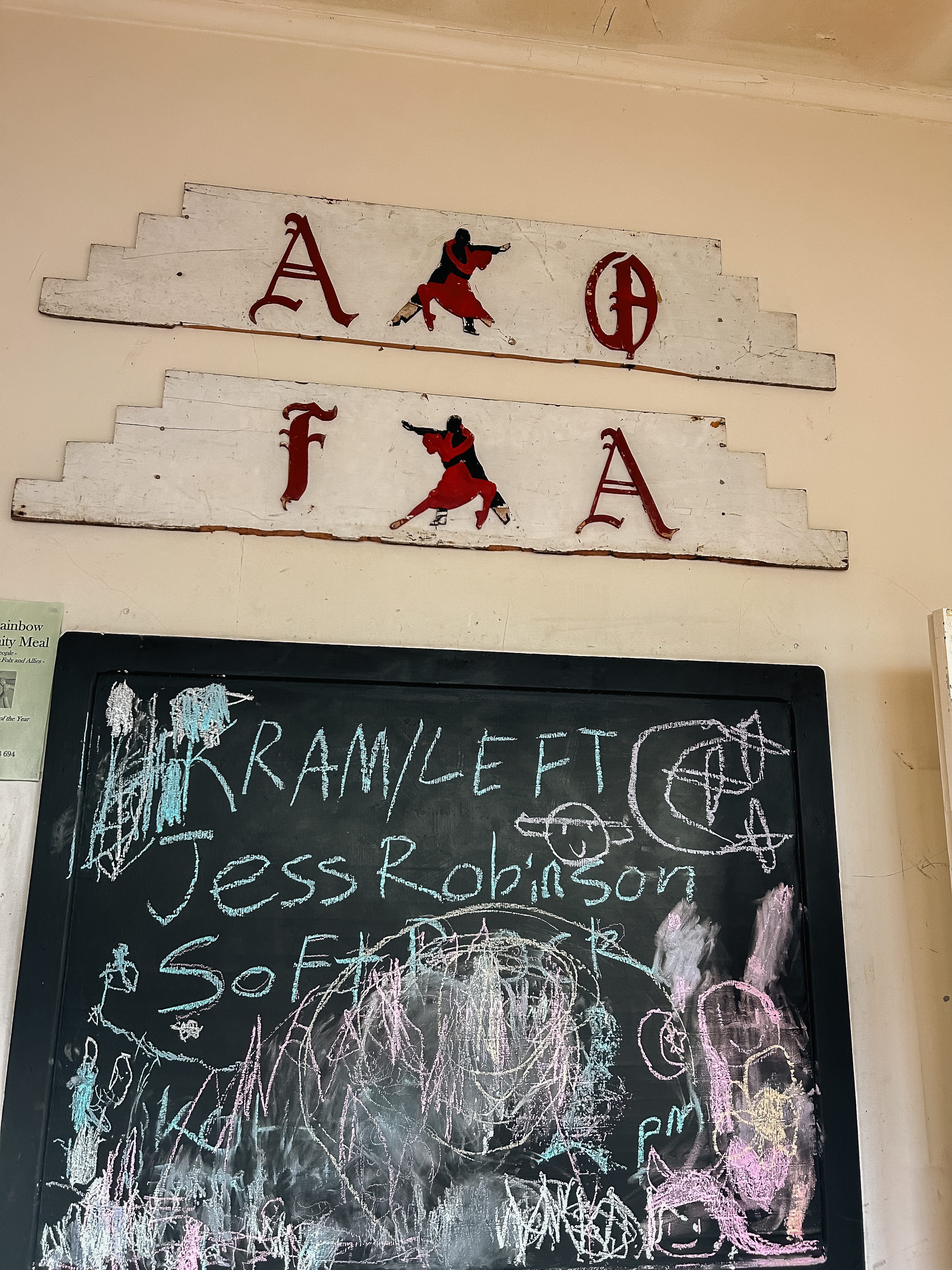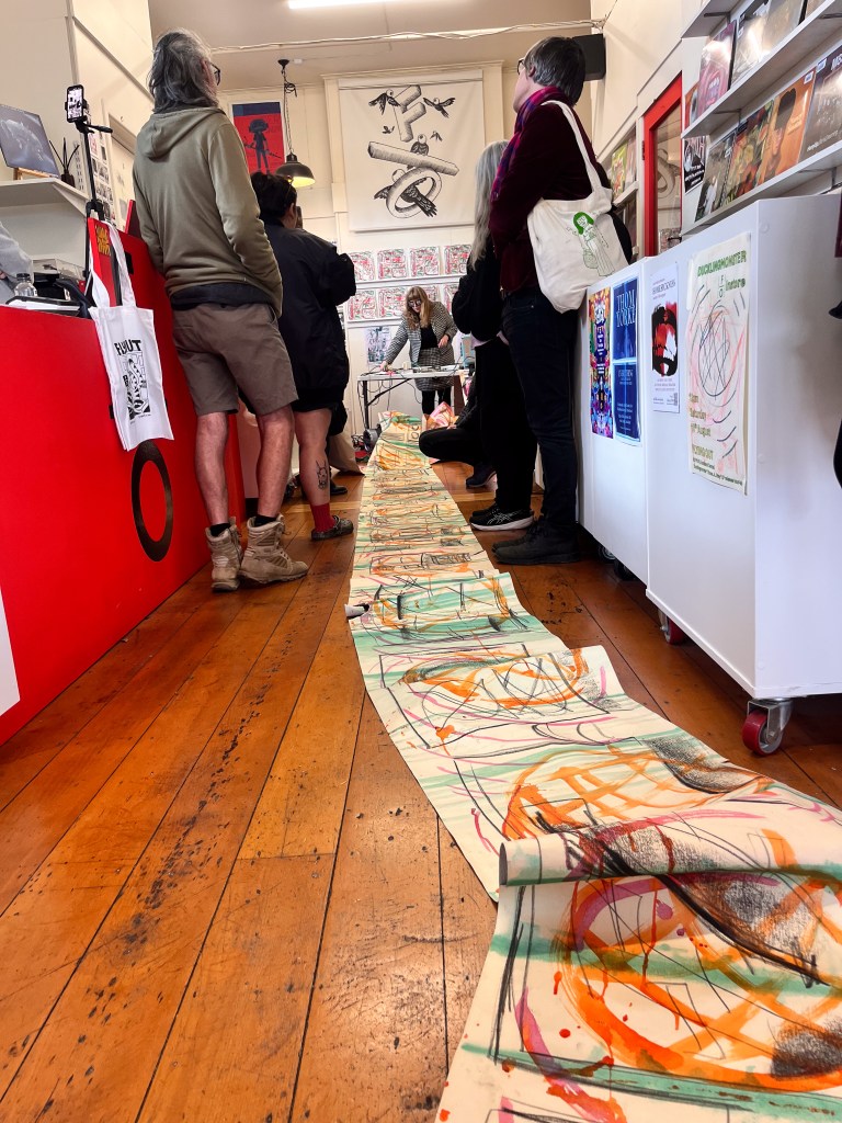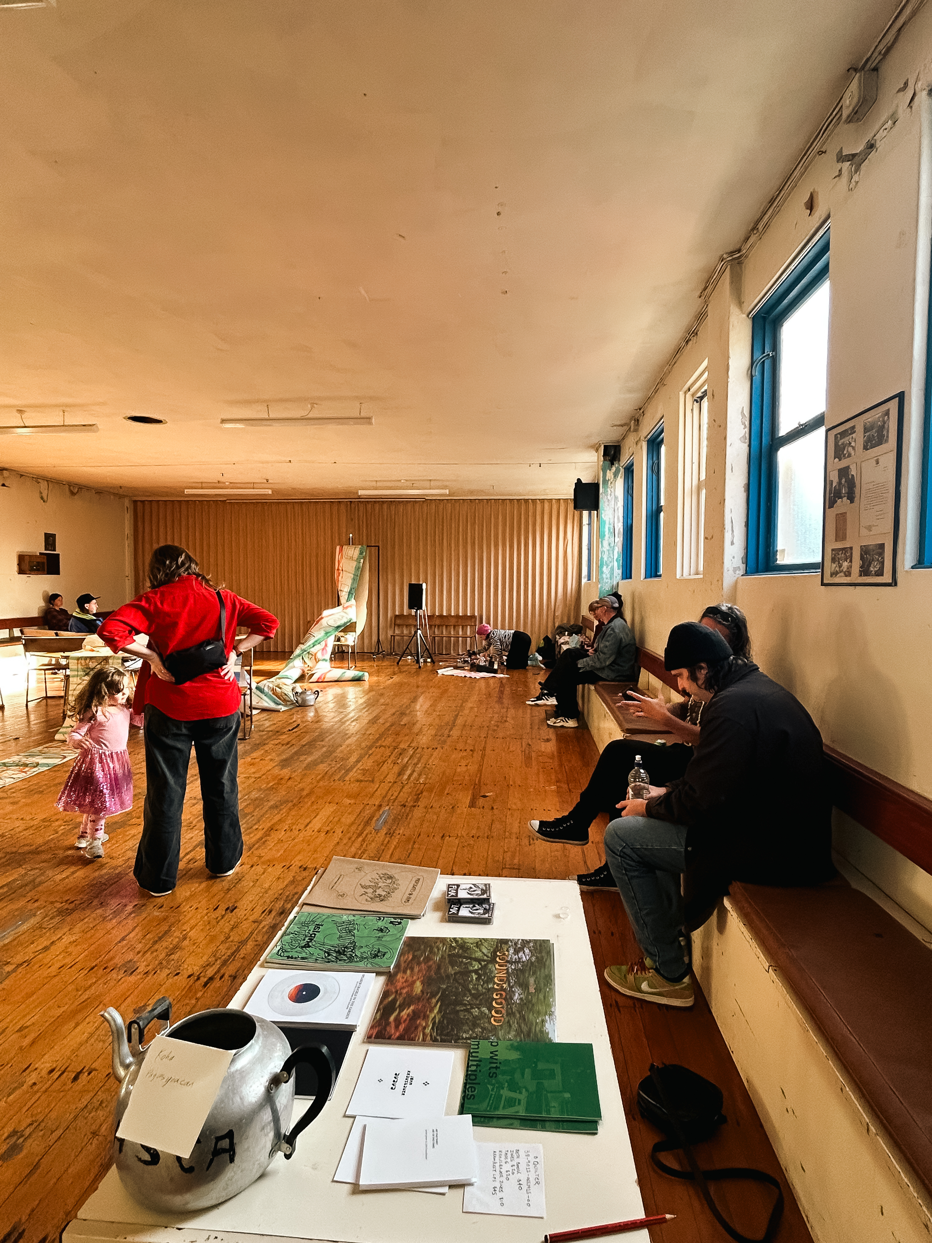 In the lobby context, the comic took the form of a programme or the play sheet of “coming attractions”. Rather than listing or outlining expected events, it contained a series of considerations of listening as experienced at the Hollywood in Avondale and in connection to Karangahape Road home of both my apartment and the Audio Foundation, the festival’s organising body. The comic was offered as an invitation to deep listen, with some of the text being instructional. This publication was printed on lightweight newsprint using risograph layering of four colours: a ground wave of pink and gold, images in orange and text in blue. On a site visit to the Hollywood with the Outlier technical team, I made beeswax crayon frottage drawings. A waveform drawn with the texture of the Hollywood’s brick exterior became the repeated printed throughline of the comics pages. A printed echo of the sound waves moving through inhabited spaces. Pages as rooms. When not hosting noisy festivals, Hollywood has a curated programme of cult, classic and experimental cinema alongside expanded cinema experiences such as the tribute to avant-garde composer Catherine Christer Hennix that Rachel Shearer and I played before the screening of the documentary Sisters With Transistors.