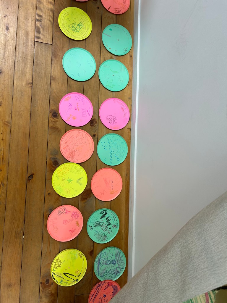 At other times, the field recording can introduce deliberate socio-symbolic sound in relation to my noise table. From 3:30 pm on weekdays, I hear the exuberant human voices of the teenagers walking up to Karangahape Rd from Auckland Girls Grammar. When this raucous choir is recorded along with the crackling samples of 1960s girl group 7” records, the relation of these sounds when listened back to in the context of my installation, I can build a form of sonic storytelling where the melodramatic girl group becomes a feminist rebel yell. In the city, social circadian rhythms continually cue listening. On Thursday through to Saturday from 5 pm, I listen to the social revellers on the street below, interspersed with the popular music, often that of divas, emitted from the drag cabaret club across the road. The field recording of these sounds, along with my playing beats and percussive shuffles of my ready-made instruments, such as the stringed beads in a bowl, builds a listening narrative reminiscent of makeshift discos where friends congregate with friends to listen and perform music in intimate settings. This listening is a form of Voegelin’s possible sonic world-building; narratives imagined through listening to present and imagined bodies. In my practice, the audio-visual event, is led by these sonic possible worlds. When the recording made at my noise table in my apartment is performed and played in the context of the installation event the listening is heightened through the relations to the objects of the installation, such as the comics taking phrases from those girl group 7”s or the bright colours of the inks drawn from the brightness of a night on the town.